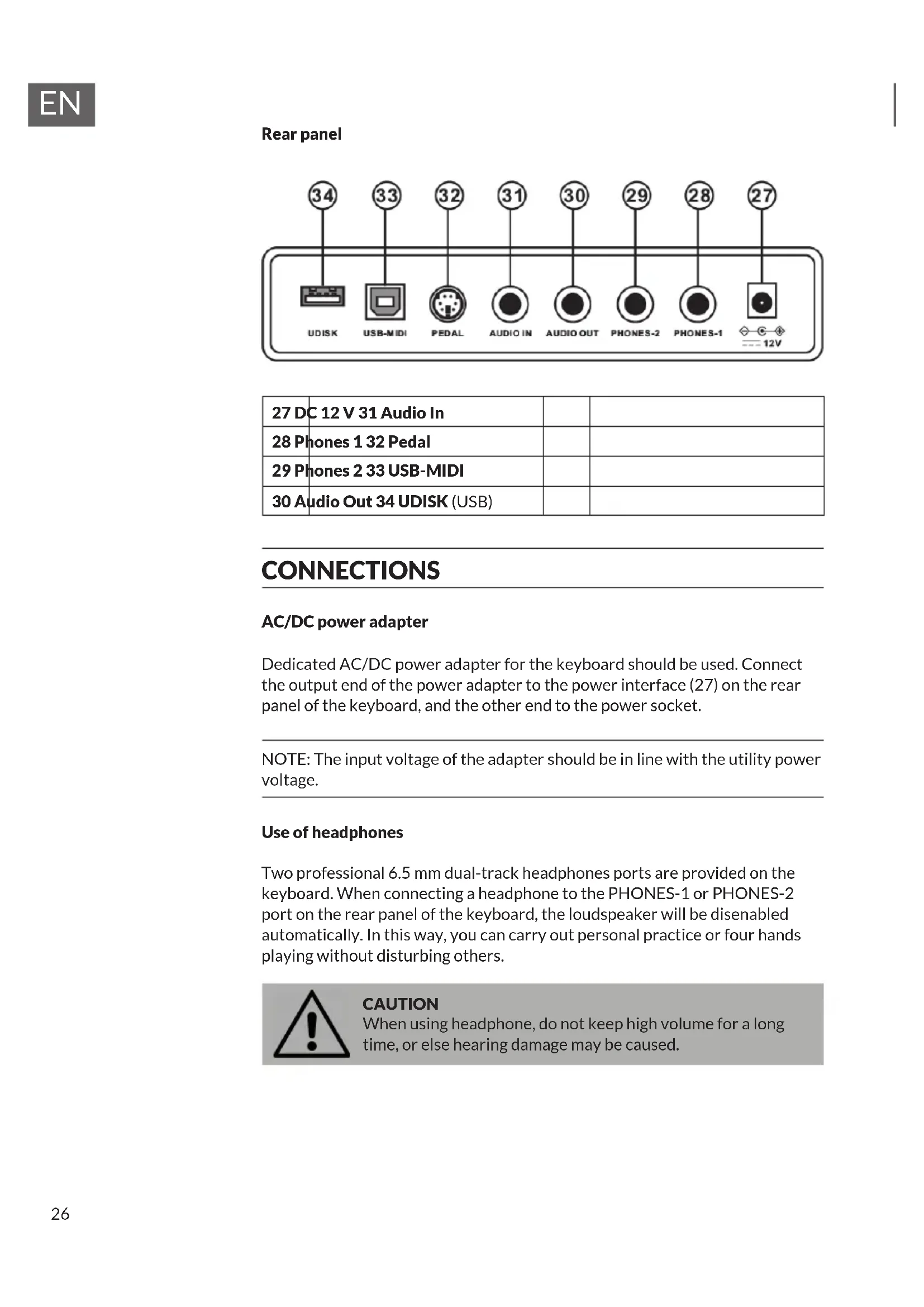 Rear panel 27 DC 12 V 31 Audio In 28 Phones 1 32 Pedal 29 Phones 2 33 USB-MIDI 30 Audio Out 34 UDISK (USB) CONNECTIONS AC/DC power adapter Dedicated AC/DC power adapter for the keyboard should be used. Connect the output end of the power adapter to the power interface (27) on the rear panel of the keyboard, and the other end to the power socket. NOTE: The input voltage of the adapter should be in line with the utility power voltage. Use of headphones Two professional 6.5 mm dual-track headphones ports are provided on the keyboard. When connecting a headphone to the PHONES-1 or PHONES-2 port on the rear panel of the keyboard, the loudspeaker will be disenabled automatically. In this way, you can carry out personal practice or four hands playing without disturbing others. CAUTION When using headphone, do not keep high volume for a long time, or else hearing damage may be caused.27