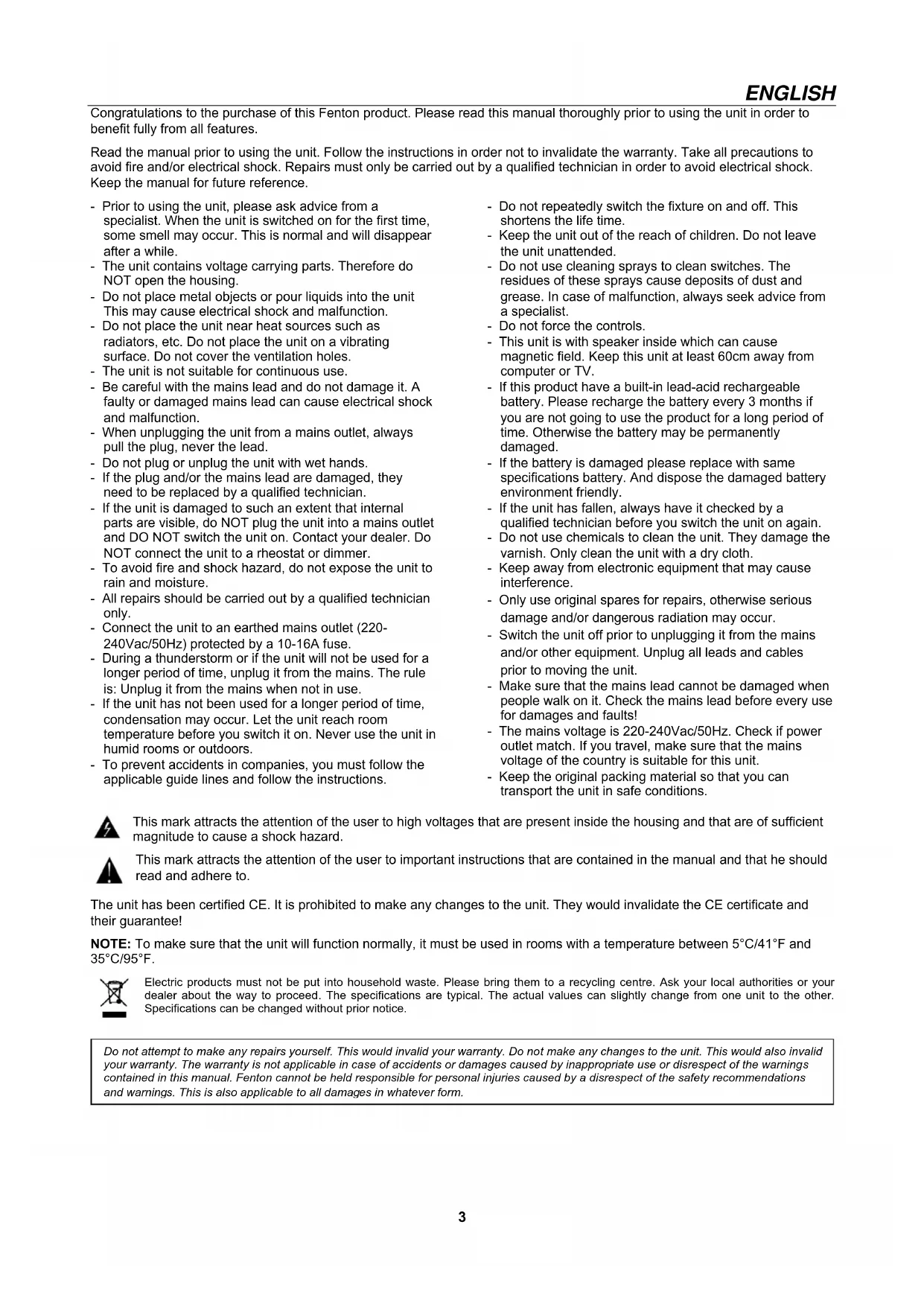 V1.023 ENGLISH Congratulations to the purchase of this Fenton product. Please read this manual thoroughly prior to using the unit in order to benefit fully from all features. Read the manual prior to using the unit. Follow the instructions in order not to invalidate the warranty. Take all precautions to avoid fire and/or electrical shock. Repairs must only be carried out by a qualified technician in order to avoid electrical shock. Keep the manual for future reference. - Prior to using the unit, please ask advice from a specialist. When the unit is switched on for the first time, some smell may occur. This is normal and will disappear after a while. - The unit contains voltage carrying parts. Therefore do NOT open the housing. - Do not place metal objects or pour liquids into the unit This may cause electrical shock and malfunction. - Do not place the unit near heat sources such as radiators, etc. Do not place the unit on a vibrating surface. Do not cover the ventilation holes. - The unit is not suitable for continuous use. - Be careful with the mains lead and do not damage it. A faulty or damaged mains lead can cause electrical shock and malfunction. - When unplugging the unit from a mains outlet, always pull the plug, never the lead. - Do not plug or unplug the unit with wet hands. - If the plug and/or the mains lead are damaged, they need to be replaced by a qualified technician. - If the unit is damaged to such an extent that internal parts are visible, do NOT plug the unit into a mains outlet and DO NOT switch the unit on. Contact your dealer. Do NOT connect the unit to a rheostat or dimmer. - To avoid fire and shock hazard, do not expose the unit to rain and moisture. - All repairs should be carried out by a qualified technician only. - Connect the unit to an earthed mains outlet (220- 240Vac/50Hz) protected by a 10-16A fuse. - During a thunderstorm or if the unit will not be used for a longer period of time, unplug it from the mains. The rule is: Unplug it from the mains when not in use. - If the unit has not been used for a longer period of time, condensation may occur. Let the unit reach room temperature before you switch it on. Never use the unit in humid rooms or outdoors. - To prevent accidents in companies, you must follow the applicable guide lines and follow the instructions. - Do not repeatedly switch the fixture on and off. This shortens the life time. - Keep the unit out of the reach of children. Do not leave the unit unattended. - Do not use cleaning sprays to clean switches. The residues of these sprays cause deposits of dust and grease. In case of malfunction, always seek advice from a specialist. - Do not force the controls. - This unit is with speaker inside which can cause magnetic field. Keep this unit at least 60cm away from computer or TV. - If this product have a built-in lead-acid rechargeable battery. Please recharge the battery every 3 months if you are not going to use the product for a long period of time. Otherwise the battery may be permanently damaged. - If the battery is damaged please replace with same specifications battery. And dispose the damaged battery environment friendly. - If the unit has fallen, always have it checked by a qualified technician before you switch the unit on again. - Do not use chemicals to clean the unit. They damage the varnish. Only clean the unit with a dry cloth. - Keep away from electronic equipment that may cause interference. - Only use original spares for repairs, otherwise serious damage and/or dangerous radiation may occur. - Switch the unit off prior to unplugging it from the mains and/or other equipment. Unplug all leads and cables prior to moving the unit. - Make sure that the mains lead cannot be damaged when people walk on it. Check the mains lead before every use for damages and faults! - The mains voltage is 220-240Vac/50Hz. Check if power outlet match. If you travel, make sure that the mains voltage of the country is suitable for this unit. - Keep the original packing material so that you can transport the unit in safe conditions. This mark attracts the attention of the user to high voltages that are present inside the housing and that are of sufficient magnitude to cause a shock hazard. This mark attracts the attention of the user to important instructions that are contained in the manual and that he should read and adhere to. The unit has been certified CE. It is prohibited to make any changes to the unit. They would invalidate the CE certificate and their guarantee! NOTE: To make sure that the unit will function normally, it must be used in rooms with a temperature between 5°C/41°F and 35°C/95°F. Electric products must not be put into household waste. Please bring them to a recycling centre. Ask your local authorities or your dealer about the way to proceed. The specifications are typical. The actual values can slightly change from one unit to the other. Specifications can be changed without prior notice.