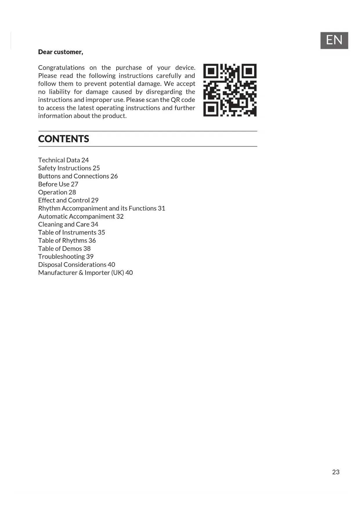 Dear customer, Congratulations on the purchase of your device. Please read the following instructions carefully and follow them to prevent potential damage. We accept no liability for damage caused by disregarding the instructions and improper use. Please scan the QR code to access the latest operating instructions and further information about the product. CONTENTS Technical Data 24 Safety Instructions 25 Buttons and Connections 26 Before Use 27 Operation 28 Effect and Control 29 Rhythm Accompaniment and its Functions 31 Automatic Accompaniment 32 Cleaning and Care 34 Table of Instruments 35 Table of Rhythms 36 Table of Demos 38 Troubleshooting 39 Disposal Considerations 40 Manufacturer & Importer (UK) 4024