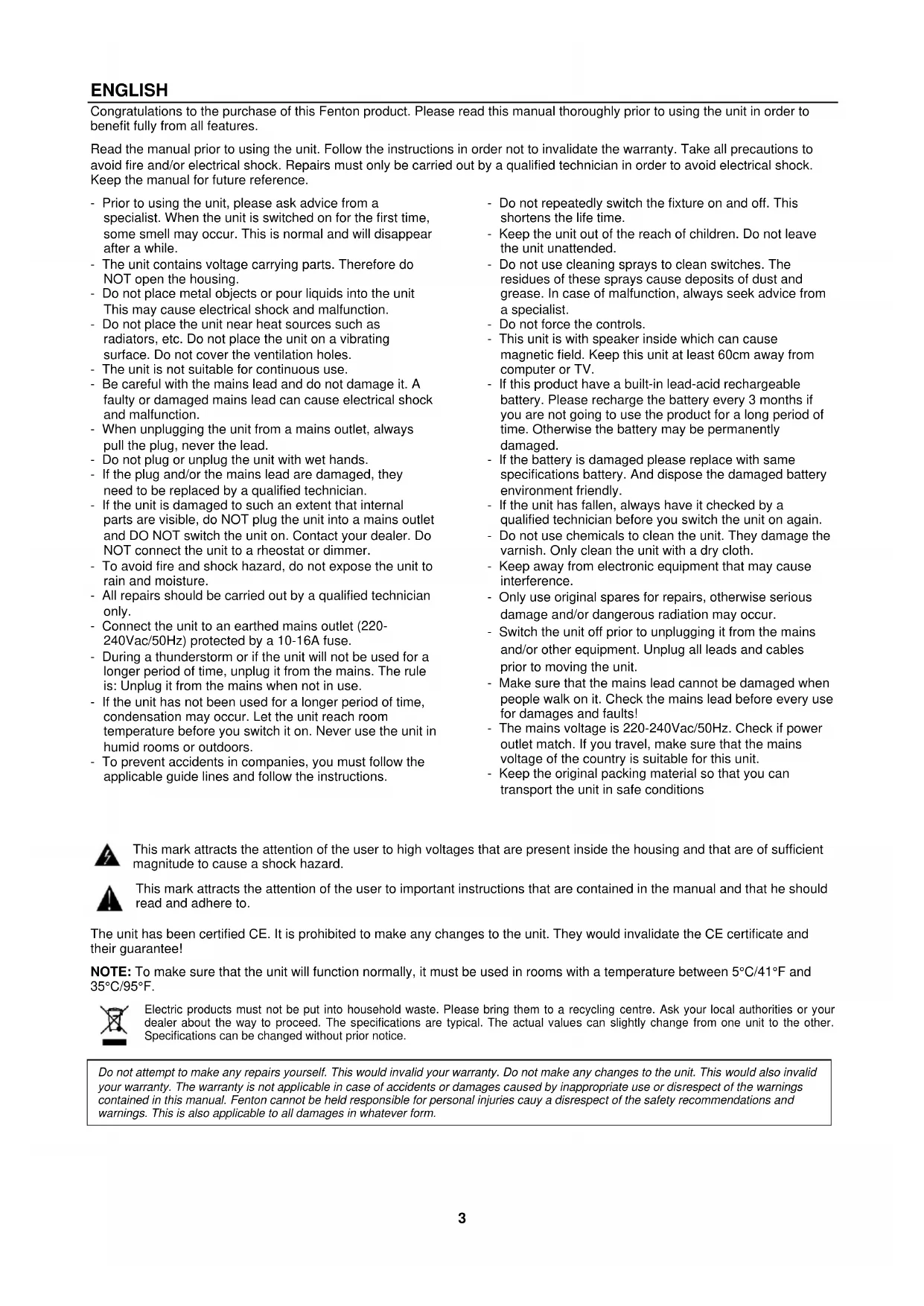 This mark attracts the attention of the user to high voltages that are present inside the housing and that are of sufficient magnitude to cause a shock hazard. This mark attracts the attention of the user to important instructions that are contained in the manual and that he should read and adhere to. The unit has been certified CE. It is prohibited to make any changes to the unit. They would invalidate the CE certificate and their guarantee! NOTE: To make sure that the unit will function normally, it must be used in rooms with a temperature between 5°C/41°F and 35°C/95°F. Electric products must not be put into household waste. Please bring them to a recycling centre. Ask your local authorities or your dealer about the way to proceed. The specifications are typical. The actual values can slightly change from one unit to the other. Specifications can be changed without prior notice. Do not attempt to make any repairs yourself. This would invalid your warranty. Do not make any changes to the unit. This would also invalid your warranty. The warranty is not applicable in case of accidents or damages caused by inappropriate use or disrespect of the warnings contained in this manual. Fenton cannot be held responsible for personal injuries cauy a disrespect of the safety recommendations and warnings. This is also applicable to all damages in whatever form.4 UNPACKING INSTRUCTION CAUTION! Carefully unpack the box upon receipt. Check the contents to ensure that all parts are present and have been received in good condition. Notify the shipper immediately and retain packaging material if any parts appear damaged from shipping or the package itself shows signs of mishandling. Save the package and all packaging materials. If the product must be returned, it is important that the product is returned in the original factory box and packaging. If the device has been exposed to drastic temperature fluctuation (e.g. after transportation), do not switch it on immediately. The arising condensation water might damage your device. Leave the device switched off until it has reached room temperature. POWERSUPPLY The label on the back/under side of the product indicates the mains voltage to which it must be connected. Check that the mains voltage corresponds to this. Any other voltage than the one indicated may cause irreparable damage to the unit. The unit must also be connected directly to the mains voltage and no dimmer or adjustable power supply may be used. Always connect the device to a protected circuit (circuit breaker or fuse). Make sure the device has an appropriate electrical ground to avoid the risk of electrocution or fire.