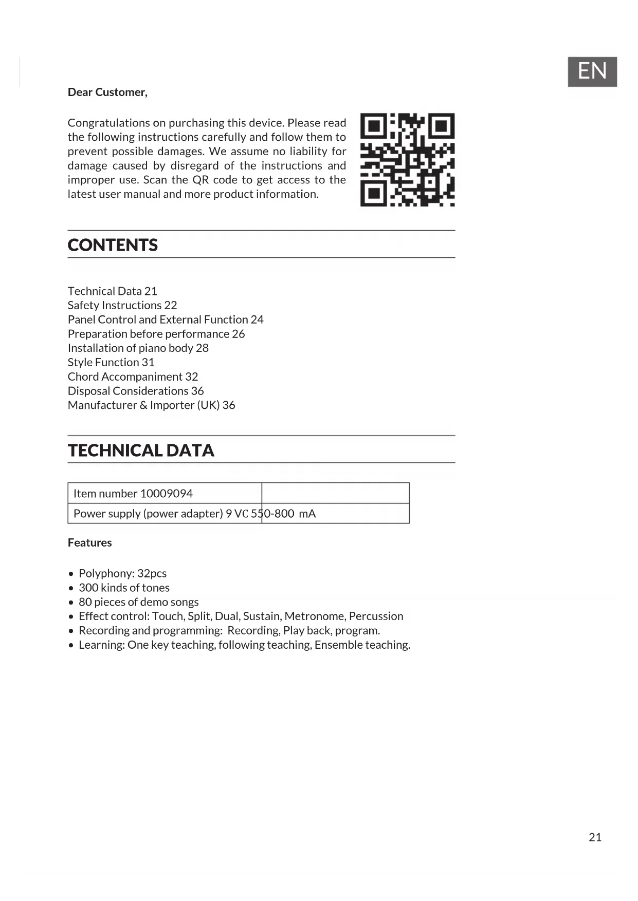 - Learning: One key teaching, following teaching, Ensemble teaching. Technical Data 21 Safety Instructions 22 Panel Control and External Function 24 Preparation before performance 26 Installation of piano body 28 Style Function 31 Chord Accompaniment 32 Disposal Considerations 36 Manufacturer & Importer (UK) 36 CONTENTS22