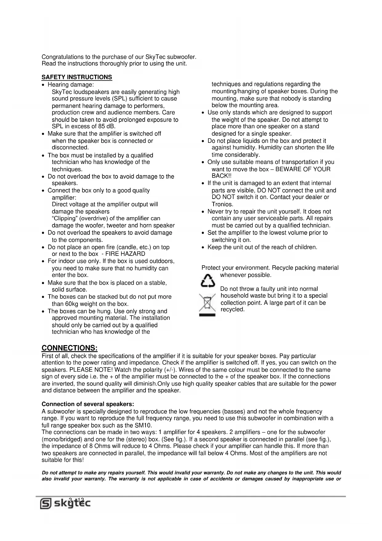 Cable Connector / Aansluitingen / Connecteur de câble / Kabelverbinder / Conector del cable : Regulatory Requirement: EN 55013 EN 55020 EN 61000-3-2/-3-33 - 13 Congratulations to the purchase of our SkyTec subwoofer. Read the instructions thoroughly prior to using the unit. SAFETY INSTRUCTIONS Hearing damage: SkyTec loudspeakers are easily generating high sound pressure levels (SPL) sufficient to cause permanent hearing damage to performers, production crew and audience members. Care should be taken to avoid prolonged exposure to SPL in excess of 85 dB. Make sure that the amplifier is switched off when the speaker box is connected or disconnected. The box must be installed by a qualified technician who has knowledge of the techniques. Do not overload the box to avoid damage to the speakers. Connect the box only to a good quality amplifier: Direct voltage at the amplifier output will damage the speakers “Clipping” (overdrive) of the amplifier can damage the woofer, tweeter and horn speaker Do not overload the speakers to avoid damage to the components. Do not place an open fire (candle, etc.) on top or next to the box - FIRE HAZARD For indoor use only. If the box is used outdoors, you need to make sure that no humidity can enter the box. Make sure that the box is placed on a stable, solid surface. The boxes can be stacked but do not put more than 60kg weight on the box. The boxes can be hung. Use only strong and approved mounting material. The installation should only be carried out by a qualified technician who has knowledge of the techniques and regulations regarding the mounting/hanging of speaker boxes. During the mounting, make sure that nobody is standing below the mounting area. Use only stands which are designed to support the weight of the speaker. Do not attempt to place more than one speaker on a stand designed for a single speaker. Do not place liquids on the box and protect it against humidity. Humidity can shorten the life time considerably. Only use suitable means of transportation if you want to move the box – BEWARE OF YOUR BACK!! If the unit is damaged to an extent that internal parts are visible, DO NOT connect the unit and DO NOT switch it on. Contact your dealer or Tronios. Never try to repair the unit yourself. It does not contain any user serviceable parts. All repairs must be carried out by a qualified technician. Set the amplifier to the lowest volume prior to switching it on. Keep the unit out of the reach of children.