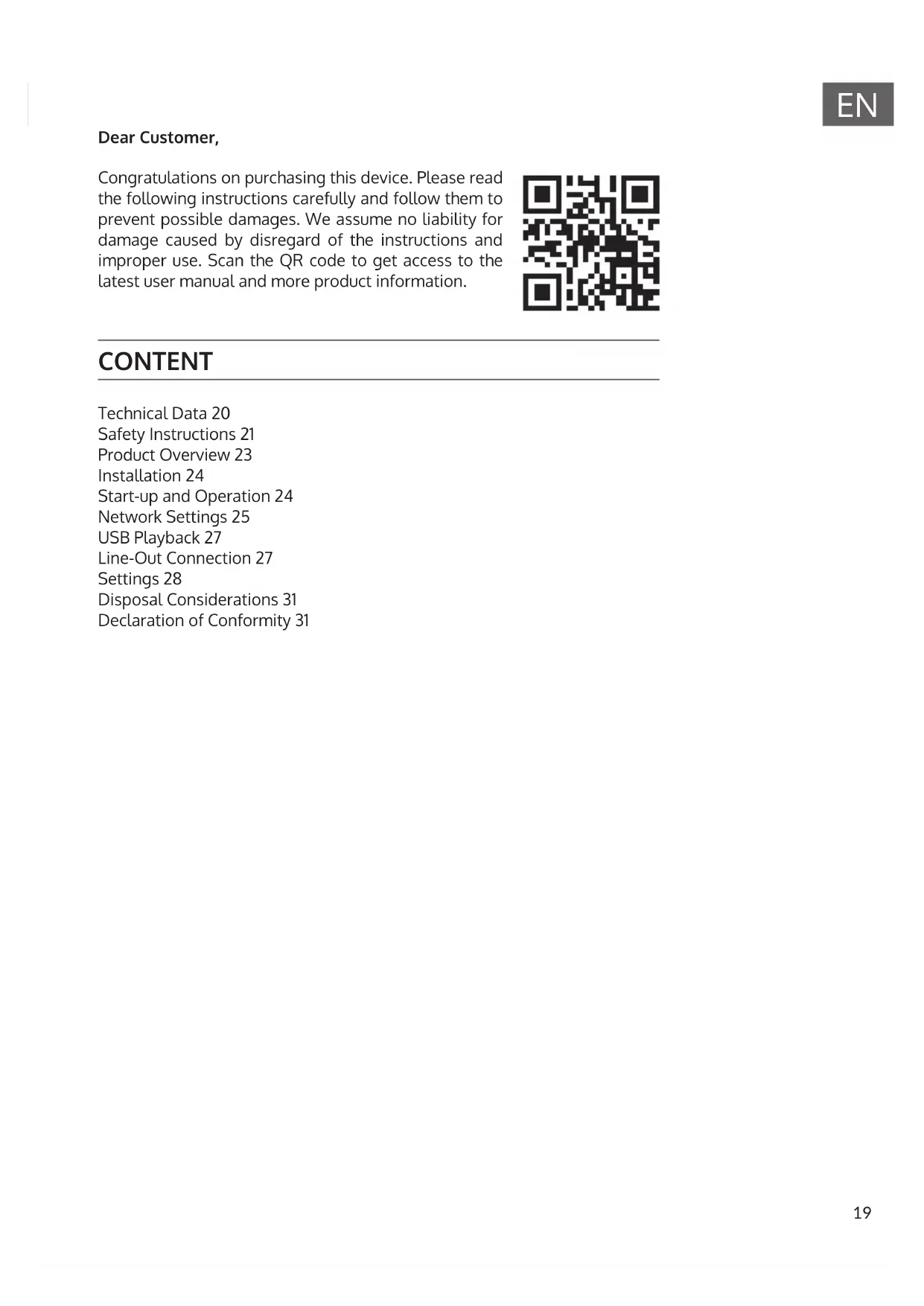 Dear Customer, Congratulations on purchasing this device. Please read the following instructions carefully and follow them to prevent possible damages. We assume no liability for damage caused by disregard of the instructions and improper use. Scan the QR code to get access to the latest user manual and more product information. CONTENT Technical Data 20 Safety Instructions 21 Product Overview 23 Installation 24 Start-up and Operation 24 Network Settings 25 USB Playback 27 Line-Out Connection 27 Settings 28 Disposal Considerations 31 Declaration of Conformity 3120