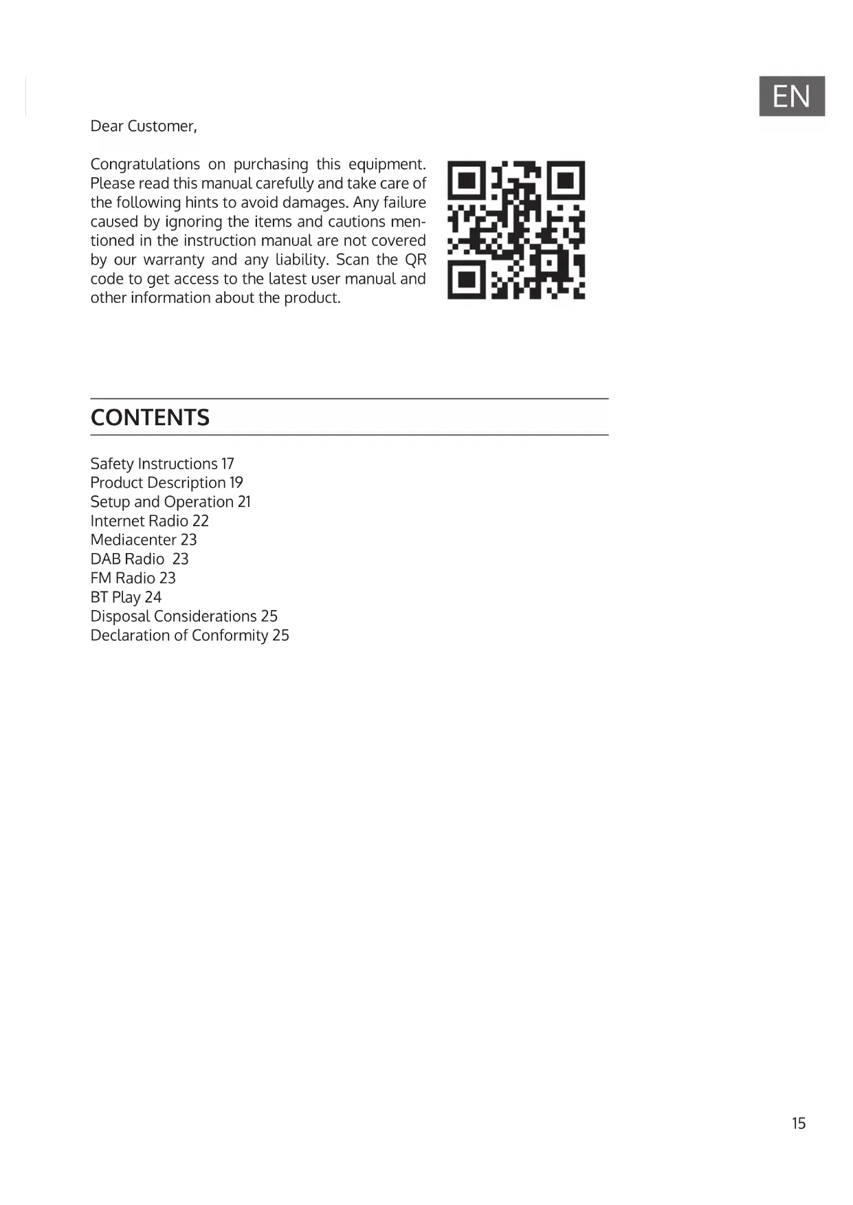 CONTENTS Safety Instructions 17 Product Description 19 Setup and Operation 21 Internet Radio 22 Mediacenter 23 DAB Radio 23 FM Radio 23 BT Play 24 Disposal Considerations 25 Declaration of Conformity 25 Dear Customer, Congratulations on purchasing this equipment. Please read this manual carefully and take care of the following hints to avoid damages. Any failure caused by ignoring the items and cautions men- tioned in the instruction manual are not covered by our warranty and any liability. Scan the QR code to get access to the latest user manual and other information about the product.16