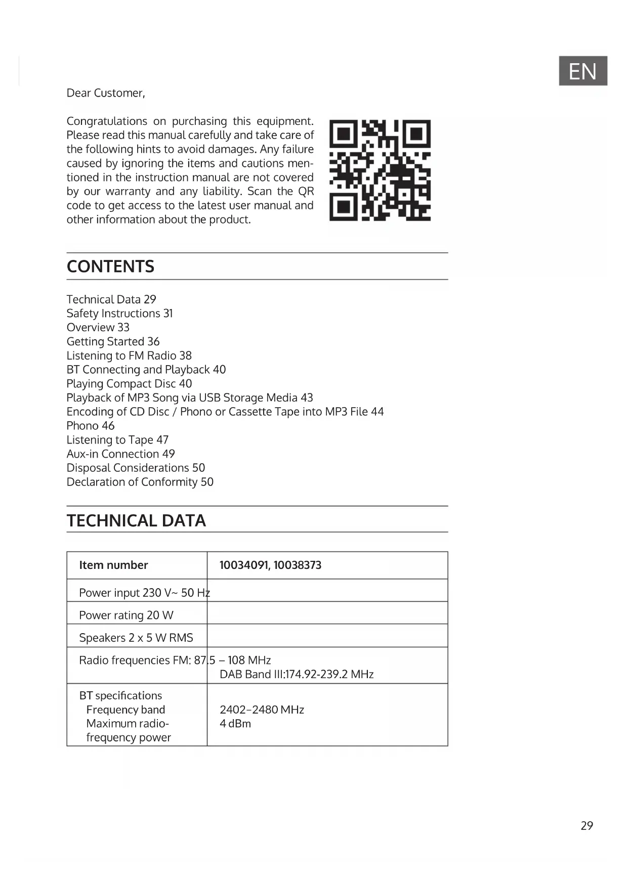 CONTENTS Technical Data 29 Safety Instructions 31 Overview 33 Getting Started 36 Listening to FM Radio 38 BT Connecting and Playback 40 Playing Compact Disc 40 Playback of MP3 Song via USB Storage Media 43 Encoding of CD Disc / Phono or Cassette Tape into MP3 File 44 Phono 46 Listening to Tape 47 Aux-in Connection 49 Disposal Considerations 50 Declaration of Conformity 50 Dear Customer, Congratulations on purchasing this equipment. Please read this manual carefully and take care of the following hints to avoid damages. Any failure caused by ignoring the items and cautions men- tioned in the instruction manual are not covered by our warranty and any liability. Scan the QR code to get access to the latest user manual and other information about the product. TECHNICAL DATA Item number 10034091, 10038373 Power input 230 V~ 50 Hz Power rating 20 W Speakers 2 x 5 W RMS Radio frequencies FM: 87.5 – 108 MHz DAB Band III:174.92-239.2 MHz BT specications Frequency band Maximum radio- frequency power 2402–2480MHz 4dBm30