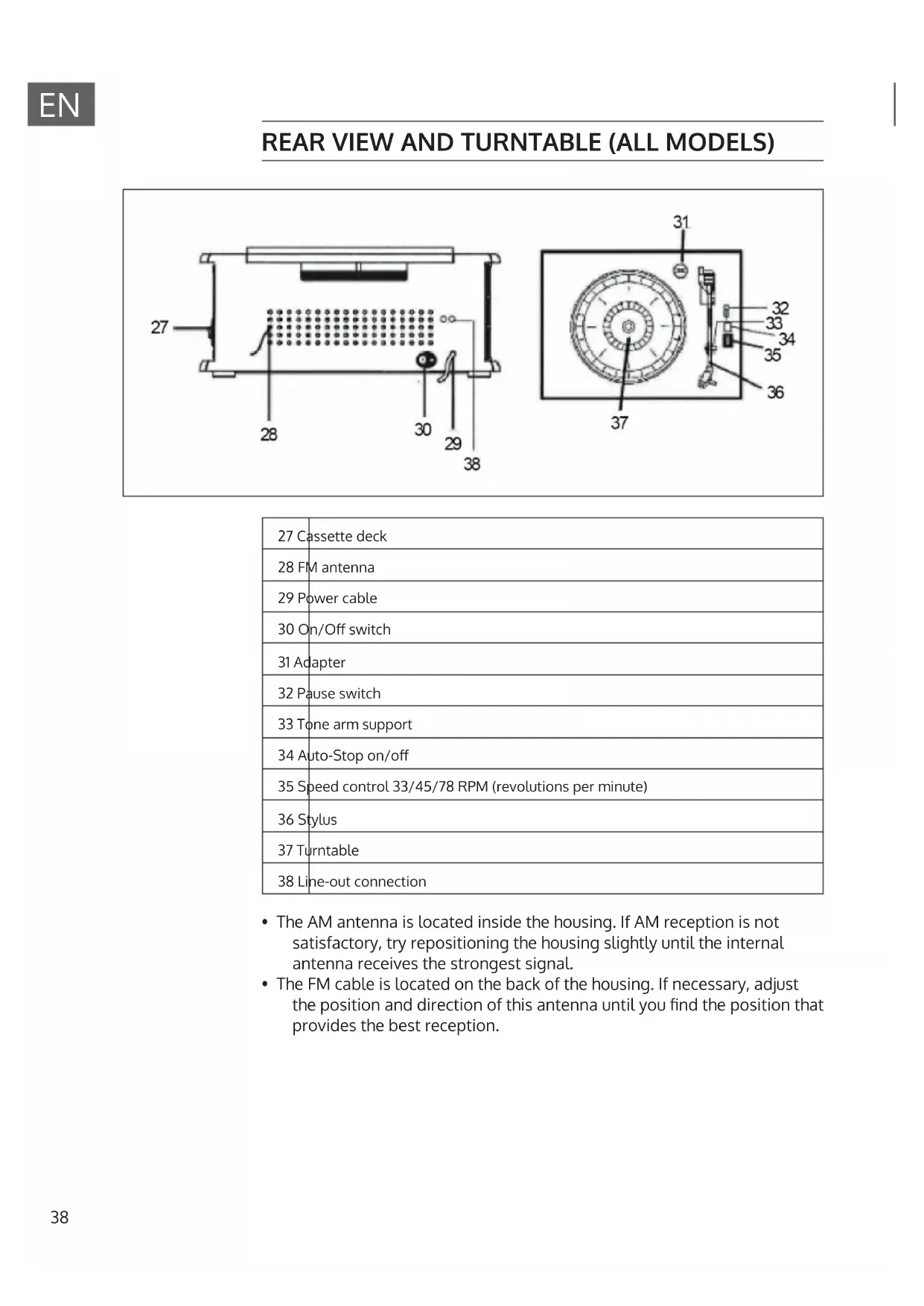 - The FM cable is located on the back of the housing. If necessary, adjust the position and direction of this antenna until you nd the position that provides the best reception.39