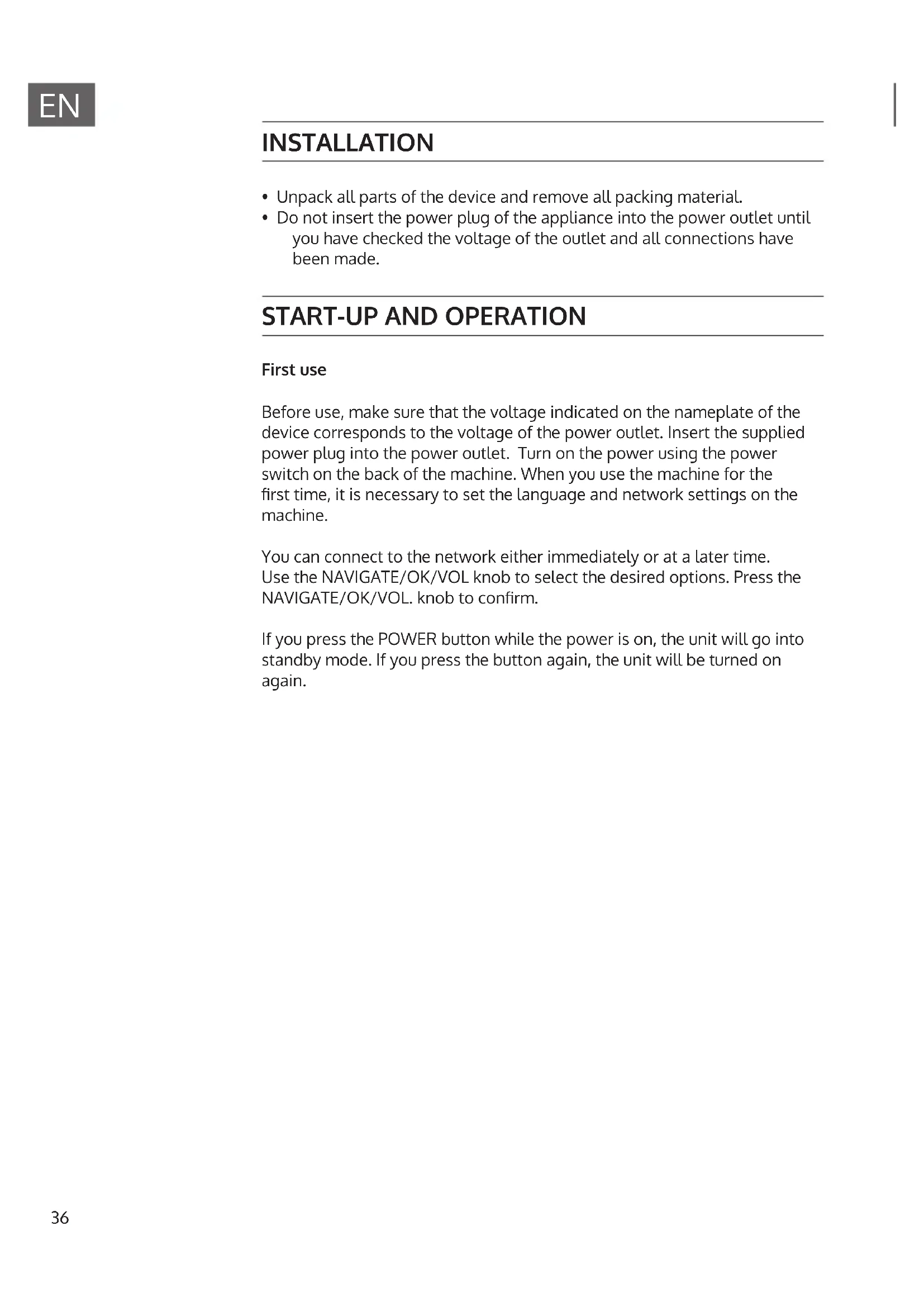 First use Before use, make sure that the voltage indicated on the nameplate of the device corresponds to the voltage of the power outlet. Insert the supplied power plug into the power outlet. Turn on the power using the power switch on the back of the machine. When you use the machine for the rst time, it is necessary to set the language and network settings on the machine. You can connect to the network either immediately or at a later time. Use the NAVIGATE/OK/VOL knob to select the desired options. Press the NAVIGATE/OK/VOL. knob to conrm. If you press the POWER button while the power is on, the unit will go into standby mode. If you press the button again, the unit will be turned on again.37