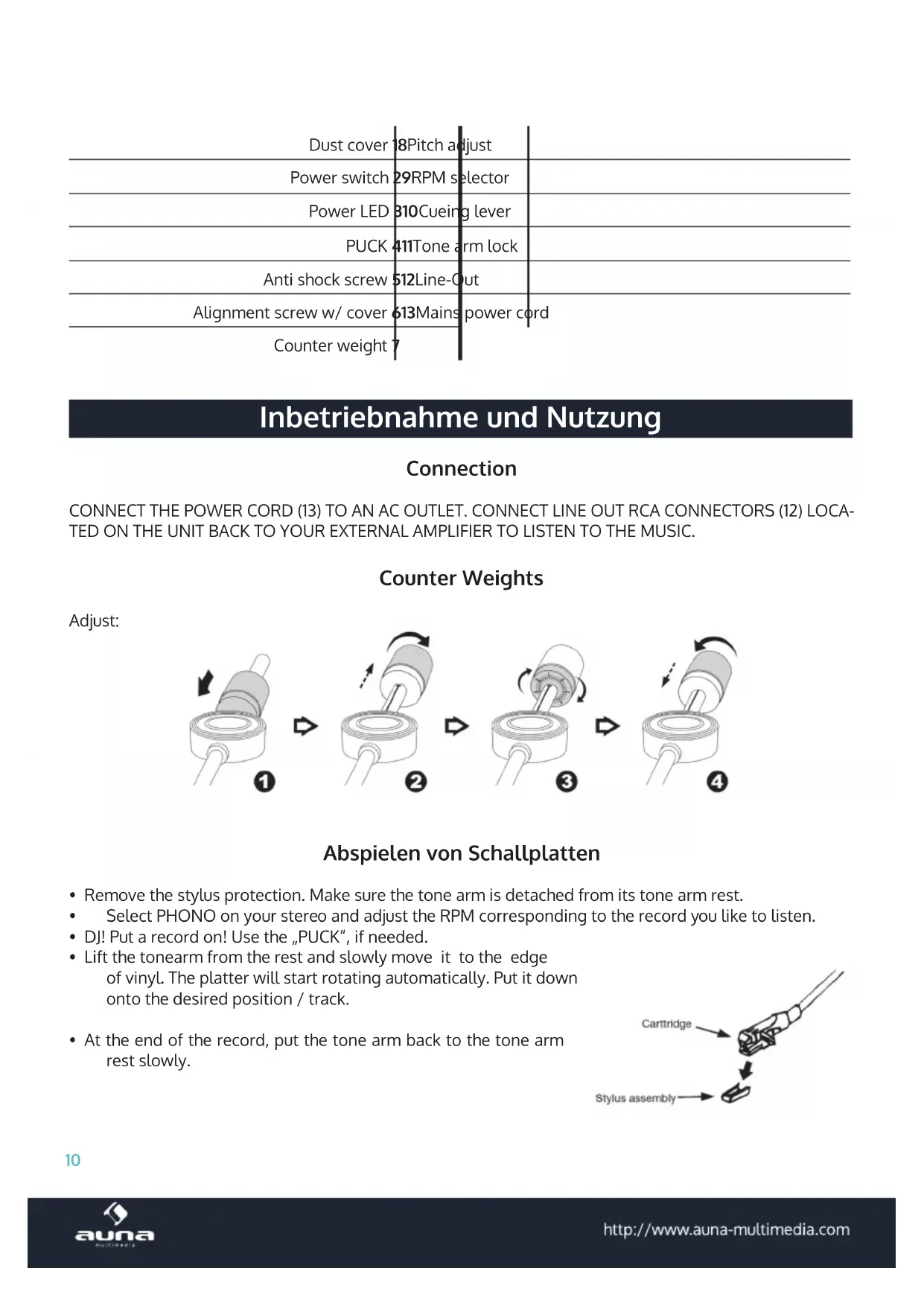 - Save these instructions. Small objects Keep small objects (i.e. screws, mounting material, memory cards etc.) and packaging out of the range of children. Do not let Children play with foil. Choking hazard! Transporting the device Please keep the original packaging. To gain suicient protection of the device while shipment or transpor- tation, make sure to put it back in its original packaging. Cleaning the surface Do not use any volatile liquids, detergents or the like. Use a clean dry cloth.9 Overview10 Dust cover 1 8 Pitch adjust Power switch 2 9 RPM selector Power LED 3 10 Cueing lever PUCK 4 11 Tone arm lock Anti shock screw 5 12 Line-Out Alignment screw w/ cover 6 13 Mains power cord Counter weight 7 Inbetriebnahme und Nutzung Connection CONNECT THE POWER CORD (13) TO AN AC OUTLET. CONNECT LINE OUT RCA CONNECTORS (12) LOCA- TED ON THE UNIT BACK TO YOUR EXTERNAL AMPLIFIER TO LISTEN TO THE MUSIC. Counter Weights Adjust: Abspielen von Schallplatten