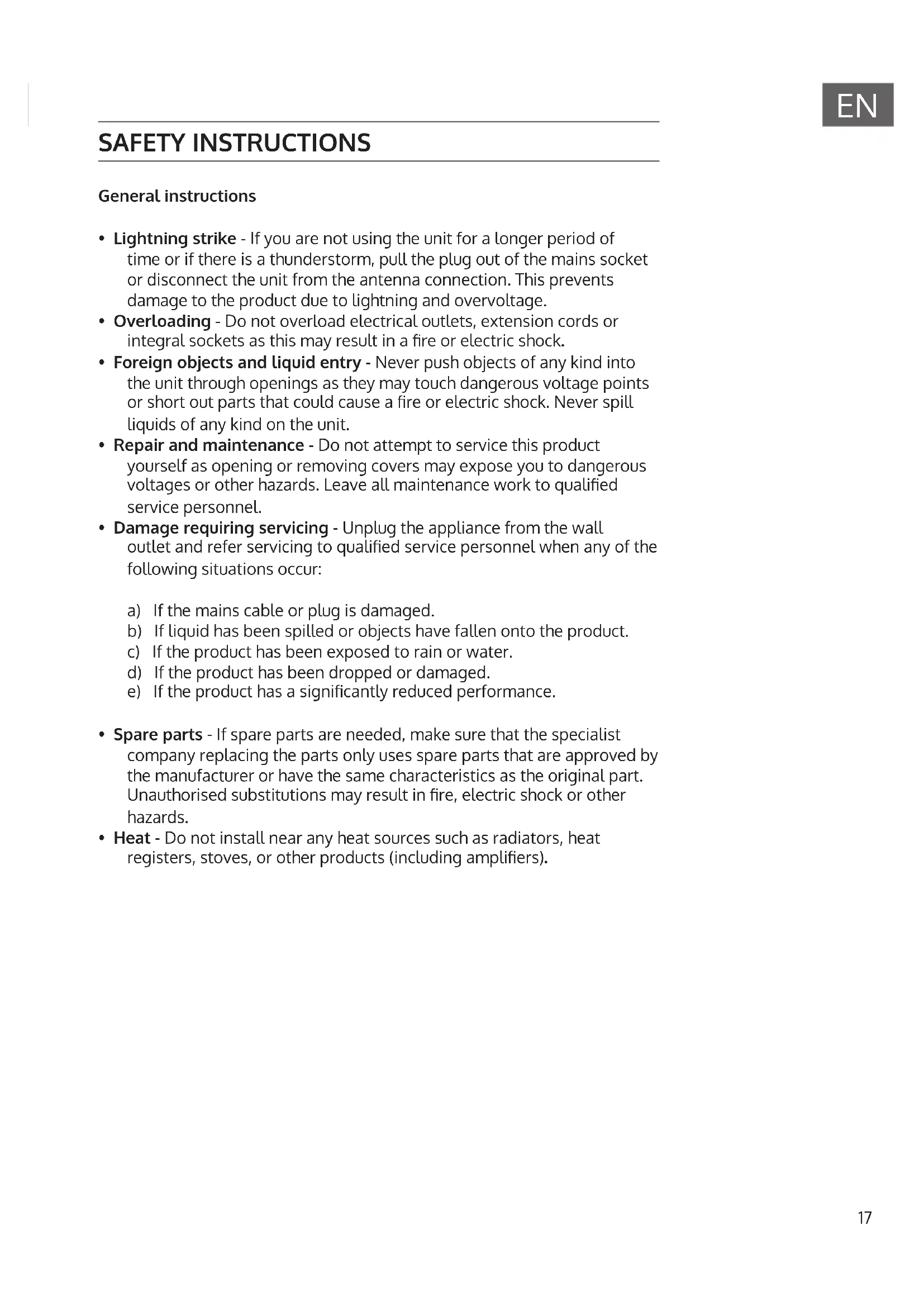 - Lightning strike - If you are not using the unit for a longer period of time or if there is a thunderstorm, pull the plug out of the mains socket or disconnect the unit from the antenna connection. This prevents damage to the product due to lightning and overvoltage.