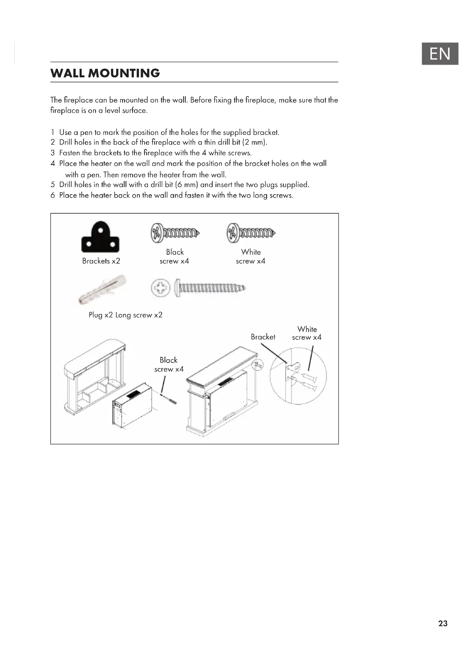 WALL MOUNTING The replace can be mounted on the wall. Before xing the replace, make sure that the replace is on a level surface. 1 Use a pen to mark the position of the holes for the supplied bracket. 2 Drill holes in the back of the replace with a thin drill bit (2 mm). 3 Fasten the brackets to the replace with the 4 white screws. 4 Place the heater on the wall and mark the position of the bracket holes on the wall with a pen. Then remove the heater from the wall. 5 Drill holes in the wall with a drill bit (6 mm) and insert the two plugs supplied. 6 Place the heater back on the wall and fasten it with the two long screws. Brackets x2 Bracket Plug x2 Long screw x2 Black screw x4 Black screw x4 White screw x4 White screw x424