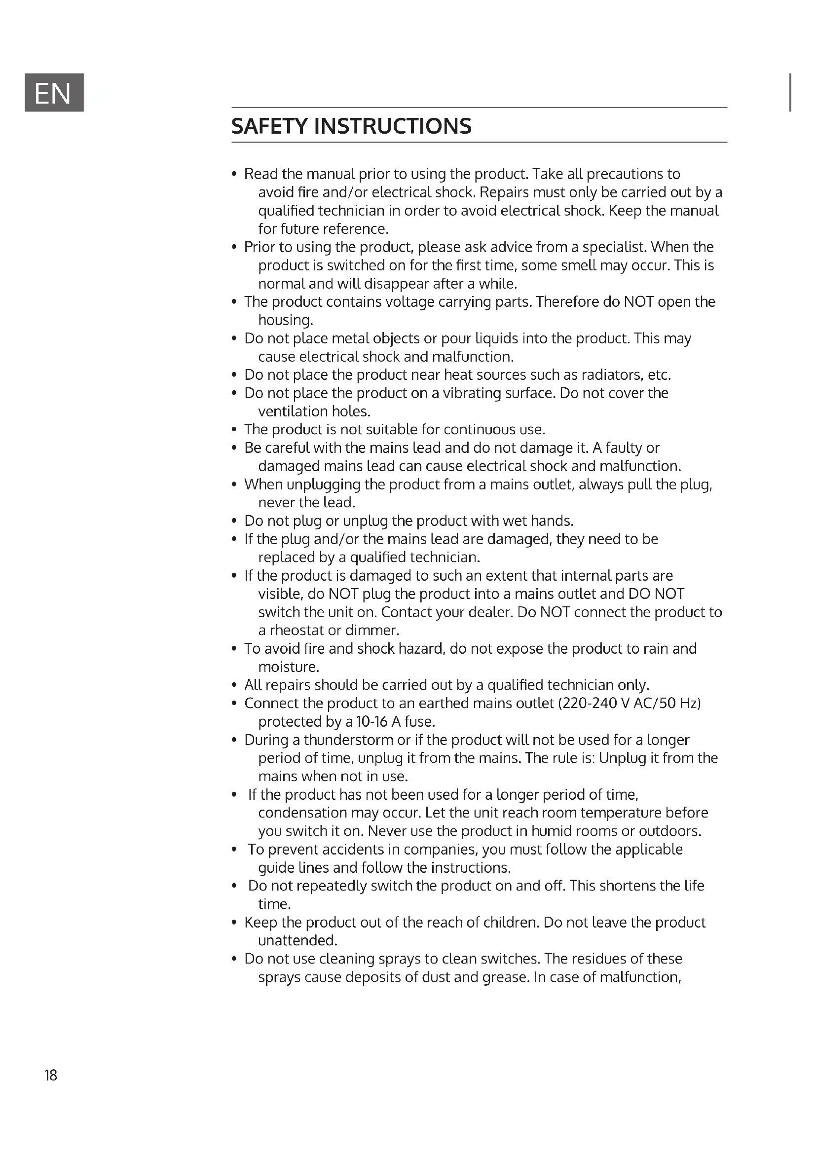 - If the product is damaged to such an extent that internal parts are visible, do NOT plug the product into a mains outlet and DO NOT switch the unit on. Contact your dealer. Do NOT connect the product to a rheostat or dimmer.