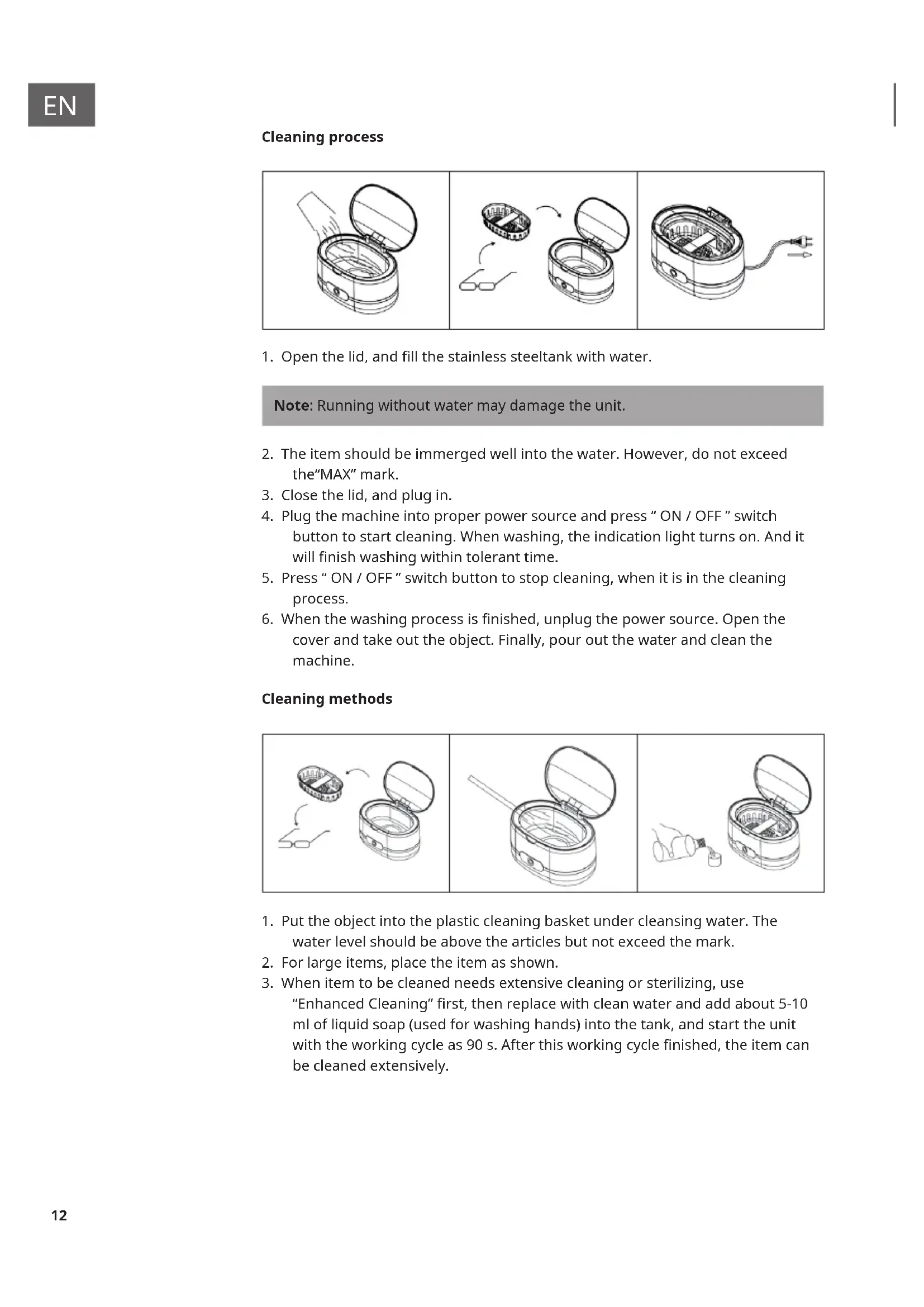 “Enhanced Cleaning” rst, then replace with clean water and add about 5-10 ml of liquid soap (used for washing hands) into the tank, and start the unit with the working cycle as 90 s. After this working cycle nished, the item can be cleaned extensively.13
