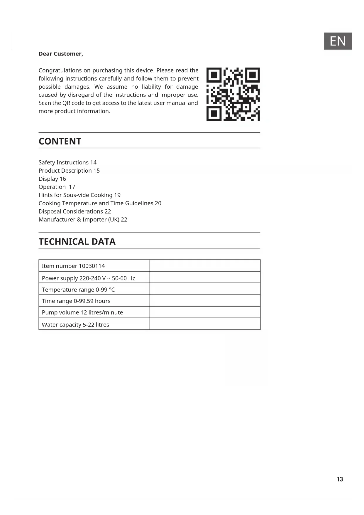Dear Customer, Congratulations on purchasing this device. Please read the following instructions carefully and follow them to prevent possible damages. We assume no liability for damage caused by disregard of the instructions and improper use. Scan the QR code to get access to the latest user manual and more product information. CONTENT Safety Instructions 14 Product Description 15 Display 16 Operation 17 Hints for Sous-vide Cooking 19 Cooking Temperature and Time Guidelines 20 Disposal Considerations 22 Manufacturer & Importer (UK) 22 TECHNICAL DATA Item number 10030114 Power supply 220-240 V ~ 50-60 Hz Temperature range 0-99 °C Time range 0-99.59 hours Pump volume 12 litres/minute Water capacity 5-22 litres14