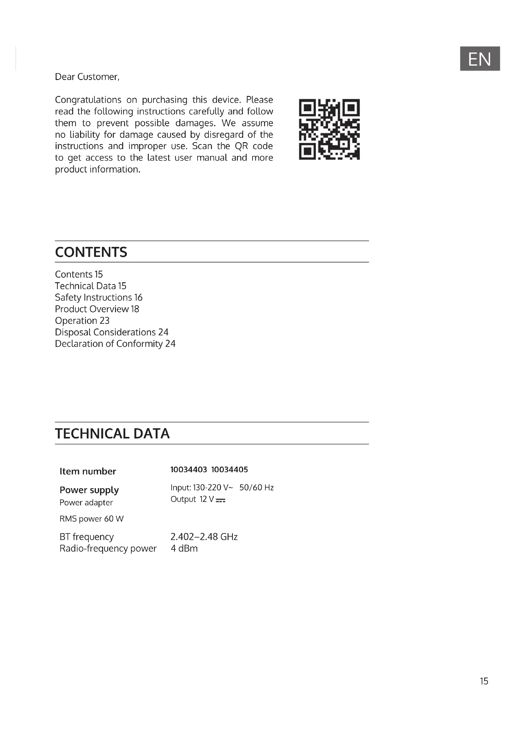 Dear Customer, Congratulations on purchasing this device. Please read the following instructions carefully and follow them to prevent possible damages. We assume no liability for damage caused by disregard of the instructions and improper use. Scan the QR code to get access to the latest user manual and more product information. TECHNICAL DATA Item number