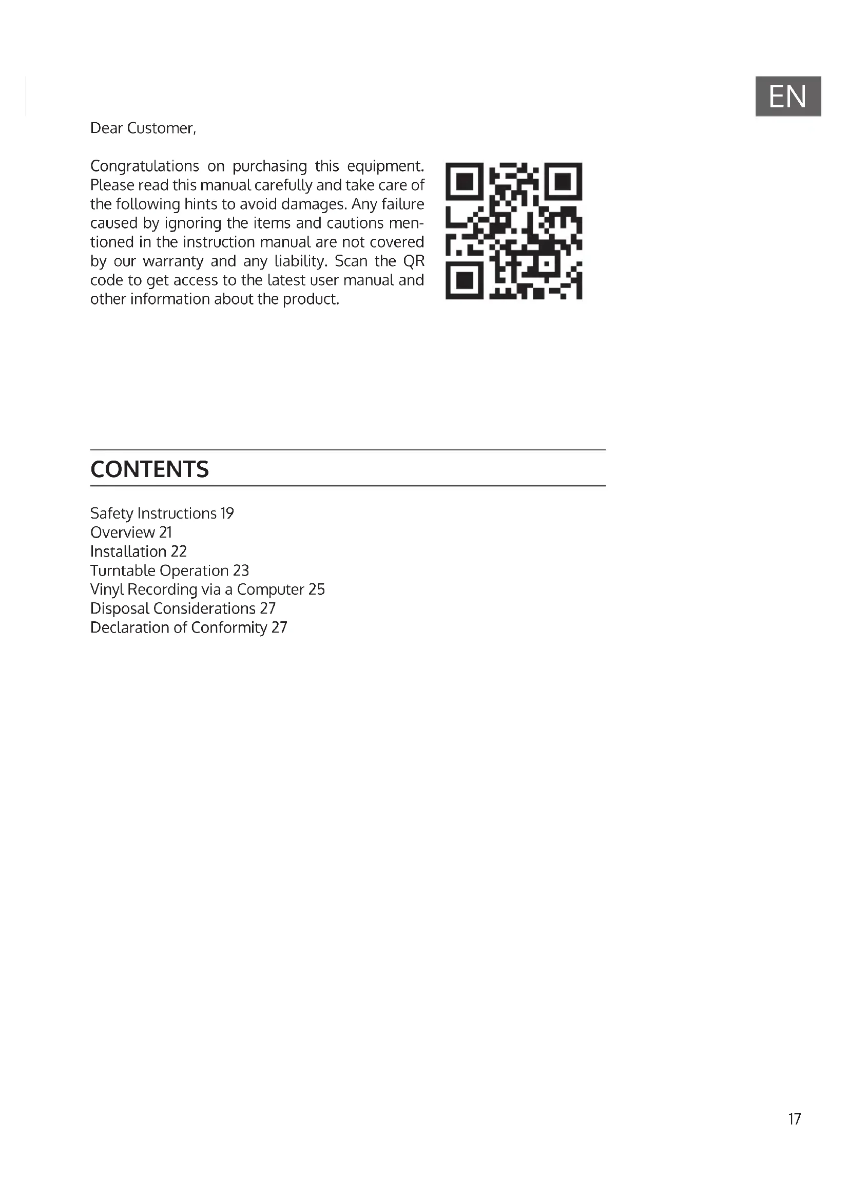 CONTENTS Safety Instructions 19 Overview 21 Installation 22 Turntable Operation 23 Vinyl Recording via a Computer 25 Disposal Considerations 27 Declaration of Conformity 27 Dear Customer, Congratulations on purchasing this equipment. Please read this manual carefully and take care of the following hints to avoid damages. Any failure caused by ignoring the items and cautions men- tioned in the instruction manual are not covered by our warranty and any liability. Scan the QR code to get access to the latest user manual and other information about the product.18