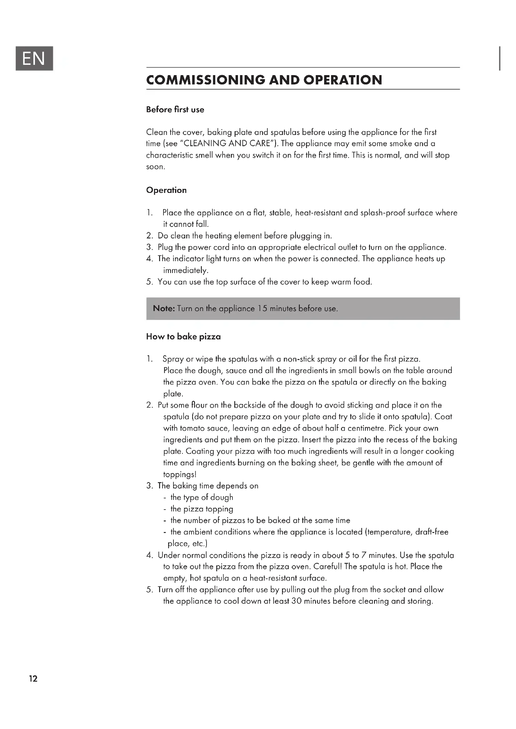 Note: Turn on the appliance 15 minutes before use. How to bake pizza