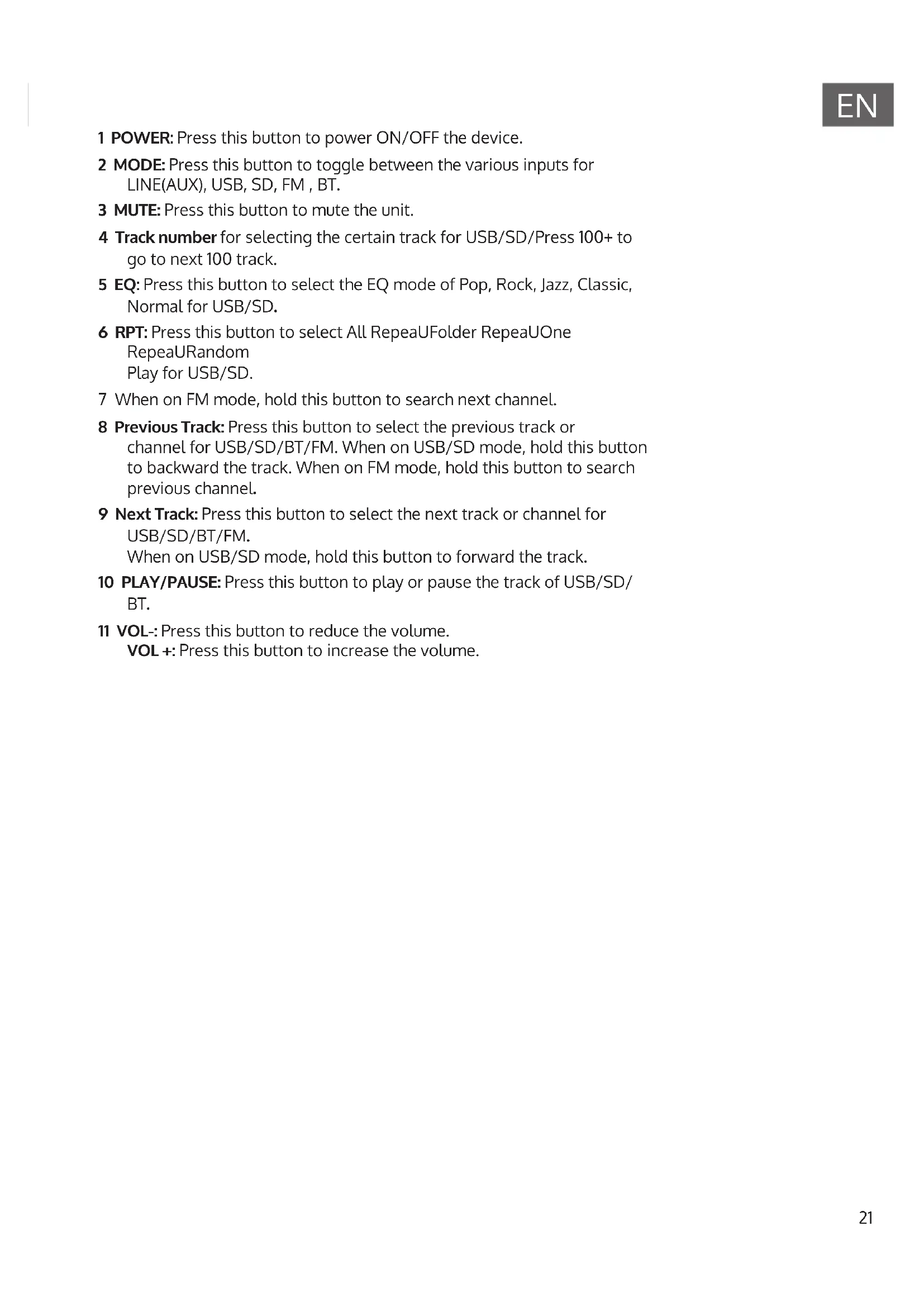1 POWER: Press this button to power ON/OFF the device. 2 MODE: Press this button to toggle between the various inputs for LINE(AUX), USB, SD, FM , BT. 3 MUTE: Press this button to mute the unit. 4 Track number for selecting the certain track for USB/SD/Press 100+ to go to next 100 track. 5 EQ: Press this button to select the EQ mode of Pop, Rock, Jazz, Classic, Normal for USB/SD. 6 RPT: Press this button to select All RepeaUFolder RepeaUOne RepeaURandom Play for USB/SD. 7 When on FM mode, hold this button to search next channel. 8 Previous Track: Press this button to select the previous track or channel for USB/SD/BT/FM. When on USB/SD mode, hold this button to backward the track. When on FM mode, hold this button to search previous channel. 9 Next Track: Press this button to select the next track or channel for USB/SD/BT/FM. When on USB/SD mode, hold this button to forward the track. 10 PLAY/PAUSE: Press this button to play or pause the track of USB/SD/ BT. 11 VOL-: Press this button to reduce the volume. VOL +: Press this button to increase the volume.22