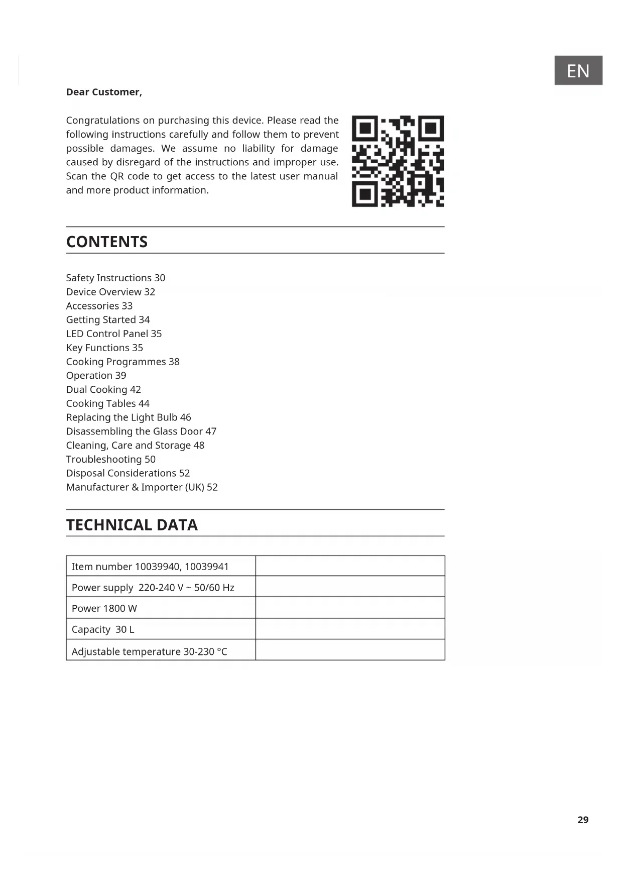 Dear Customer, Congratulations on purchasing this device. Please read the following instructions carefully and follow them to prevent possible damages. We assume no liability for damage caused by disregard of the instructions and improper use. Scan the QR code to get access to the latest user manual and more product information. CONTENTS Safety Instructions 30 Device Overview 32 Accessories 33 Getting Started 34 LED Control Panel 35 Key Functions 35 Cooking Programmes 38 Operation 39 Dual Cooking 42 Cooking Tables 44 Replacing the Light Bulb 46 Disassembling the Glass Door 47 Cleaning, Care and Storage 48 Troubleshooting 50 Disposal Considerations 52 Manufacturer & Importer (UK) 52 TECHNICAL DATA Item number 10039940, 10039941 Power supply 220-240 V ~ 50/60 Hz Power 1800 W Capacity 30 L Adjustable temperature 30-230 °C30