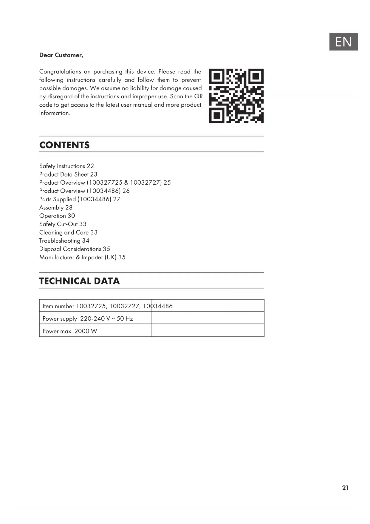 Dear Customer, Congratulations on purchasing this device. Please read the following instructions carefully and follow them to prevent possible damages. We assume no liability for damage caused by disregard of the instructions and improper use. Scan the QR code to get access to the latest user manual and more product information. CONTENTS Safety Instructions22 Product Data Sheet23 Product Overview (100327725 & 10032727)25 Product Overview (10034486)26 Parts Supplied (10034486)27 Assembly28 Operation30 Safety Cut-Out33 Cleaning and Care33 Troubleshooting34 Disposal Considerations35 Manufacturer & Importer (UK)35 TECHNICAL DATA Item number 10032725, 10032727, 10034486 Power supply 220-240 V ~ 50 Hz Power max. 2000 W22