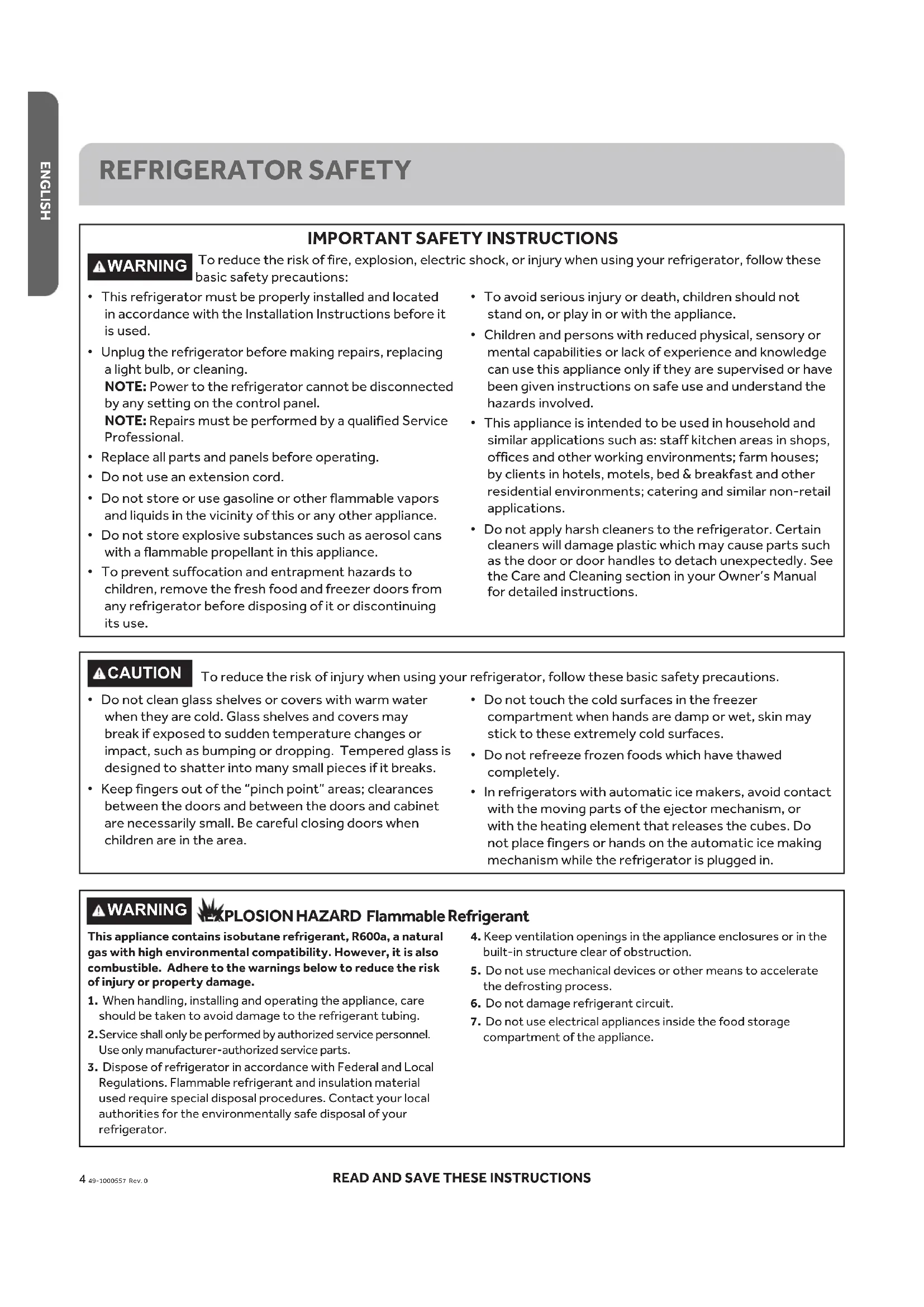 WARNING To reduce the risk of fire, explosion, electric shock, or injury when using your refrigerator, follow these basic safety precautions: ¿ This refrigerator must be properly installed and located in accordance with the Installation Instructions before it is used. ¿ Unplug the refrigerator before making repairs, replacing a light bulb, or cleaning. NOTE: Power to the refrigerator cannot be disconnected by any setting on the control panel. NOTE: Repairs must be performed by a qualified Service Professional. ¿ Replace all parts and panels before operating. ¿ Do not use an extension cord. ¿ Do not store or use gasoline or other flammable vapors and liquids in the vicinity of this or any other appliance. ¿ Do not store explosive substances such as aerosol cans with a flammable propellant in this appliance. ¿ To prevent suffocation and entrapment hazards to children, remove the fresh food and freezer doors from any refrigerator before disposing of it or discontinuing its use. ¿ To avoid serious injury or death, children should not stand on, or play in or with the appliance. ¿ Children and persons with reduced physical, sensory or mental capabilities or lack of experience and knowledge can use this appliance only if they are supervised or have been given instructions on safe use and understand the hazards involved. ¿ This appliance is intended to be used in household and similar applications such as: staff kitchen areas in shops, offices and other working environments; farm houses; by clients in hotels, motels, bed & breakfast and other residential environments; catering and similar non-retail applications. ¿ Do not apply harsh cleaners to the refrigerator. Certain cleaners will damage plastic which may cause parts such as the door or door handles to detach unexpectedly. See the Care and Cleaning section in your Owner’s Manual for detailed instructions. WARNING EXPLOSION HAZARD Flammable Refrigerant This appliance contains isobutane refrigerant, R600a, a natural gas with high environmental compatibility. However, it is also combustible. Adhere to the warnings below to reduce the risk of injury or property damage.1. When handling, installing and operating the appliance, care should be taken to avoid damage to the refrigerant tubing.2. Service shall only be performed by authorized service personnel. Use only manufacturer-authorized service parts.3. Dispose of refrigerator in accordance with Federal and Local Regulations. Flammable refrigerant and insulation material used require special disposal procedures. Contact your local authorities for the environmentally safe disposal of your refrigerator.
