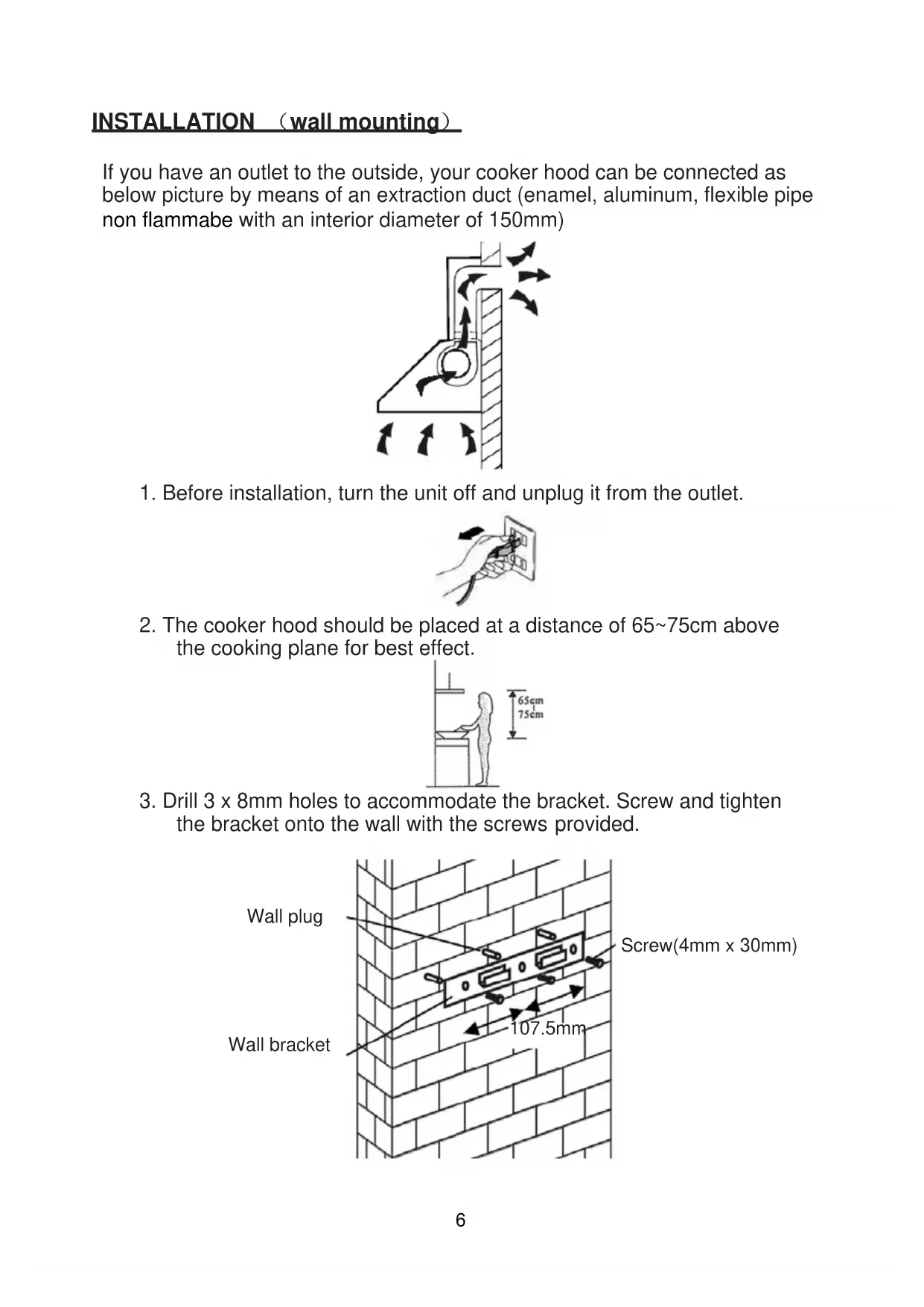 2. The cooker hood should be placed at a distance of 65~75cm above