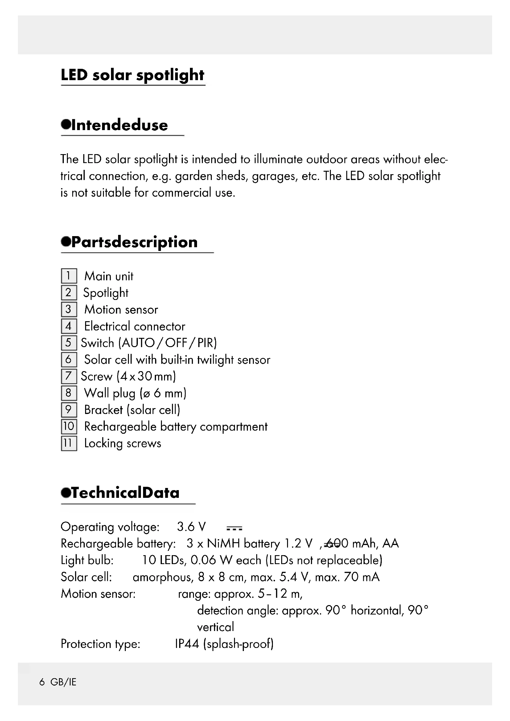 Locking screws Technical Data Operating voltage: 3.6 V Rechargeable battery: 3 x NiMH battery 1.2 V , 600 mAh, AA Light bulb: 10 LEDs, 0.06 W each (LEDs not replaceable) Solar cell: amorphous, 8 x 8 cm, max. 5.4 V, max. 70 mA Motion sensor: range: approx. 5–12 m, detection angle: approx. 90° horizontal, 90° vertical Protection type: IP44 (splash-proof)7 GB/IE Scope of delivery Check immediately after unpacking that the parts are complete and that the product is in proper condition. 1 Main unit (consisting of spotlight with 10 LEDs, motion sensor, mounting bracket with built-in batteries and built-in control) 1 Solar cell (8 cm x 8 cm) (incl. approx. 2.5 m power cable) 4 Screws (4 x 30 mm) 4 Wall plugs (ø 6 mm) 1 Instructions for assembly and use General safety instructions Before using the product, please familiarise yourself with all of the safety information and instructions for use! When passing this product on to others, please also include all the documents! This appliance can be used by children aged from 8 years and above and persons with reduced physical, sensory or mental capabilities or lack of experience and knowledge if they have been given supervision or instruction concerning use of the appliance in a safe way and un- derstand the hazards involved. Children shall not play with the appli- ance. Cleaning and user maintenance shall not be made by children without supervision. Never leave children unsupervised with the packaging material. The packaging material represents a danger of suffocation. Children fre- quently underestimate the dangers. Keep children out of the area you are working in. A large number of screws and other small parts are included with delivery. These may prove life-threatening if swallowed or inhaled. Do not use this article if you notice any damage!8 GB/IE Safety instructions for rechargeable batteries DANGER TO LIFE! Keep rechargeable batteries away from children. If accidentally swallowed seek immediate medical attention! CAUTION! EXPLOSION HAZARD! Never throw rechargeable batteries into fire or water! Do not exert mechanical loads to batteries! Do not use single-use batteries. Never short-circuit or open rechargeable batteries. Risk of property damage Only use the specified battery type! When inserting the battery ensure that it is inserted the right way round! This is shown in the battery compartment! If necessary, clean the battery and device contacts before inserting the battery! Function The solar cell