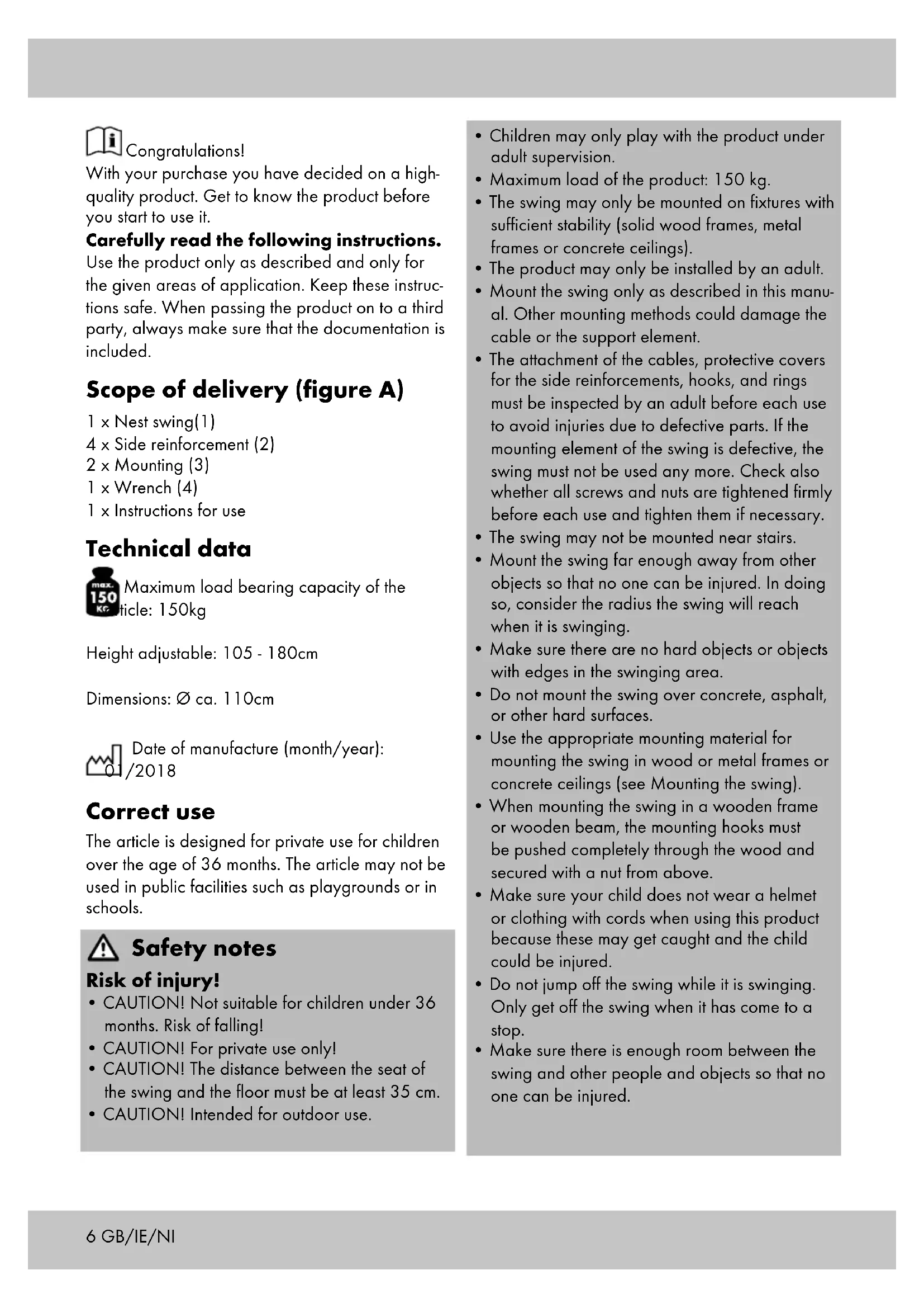 - Make sure there is enough room between the swing and other people and objects so that no one can be injured. Congratulations! With your purchase you have decided on a high- quality product. Get to know the product before you start to use it. Carefully read the following instructions. Use the product only as described and only for the given areas of application. Keep these instruc- tions safe. When passing the product on to a third party, always make sure that the documentation is included. Scope of delivery (figure A) 1 x Nest swing(1) 4 x Side reinforcement (2) 2 x Mounting (3) 1 x Wrench (4) 1 x Instructions for use Technical data Maximum load bearing capacity of the article: 150kg Height adjustable: 105 - 180cm Dimensions: Ø ca. 110cm Date of manufacture (month/year): 01/2018 Correct use The article is designed for private use for children over the age of 36 months. The article may not be used in public facilities such as playgrounds or in schools. Safety notes Risk of injury!