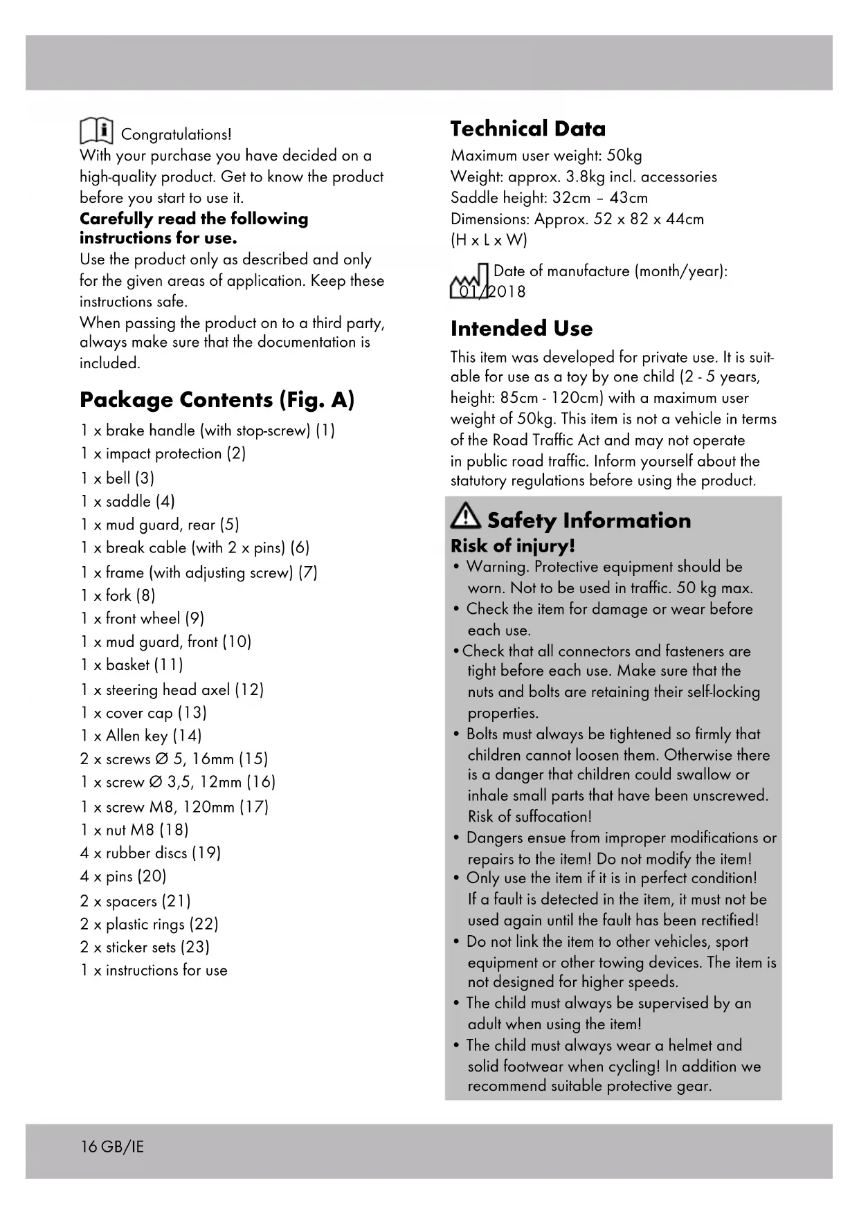 - The child must always wear a helmet and solid footwear when cycling! In addition we recommend suitable protective gear.17GB/IE