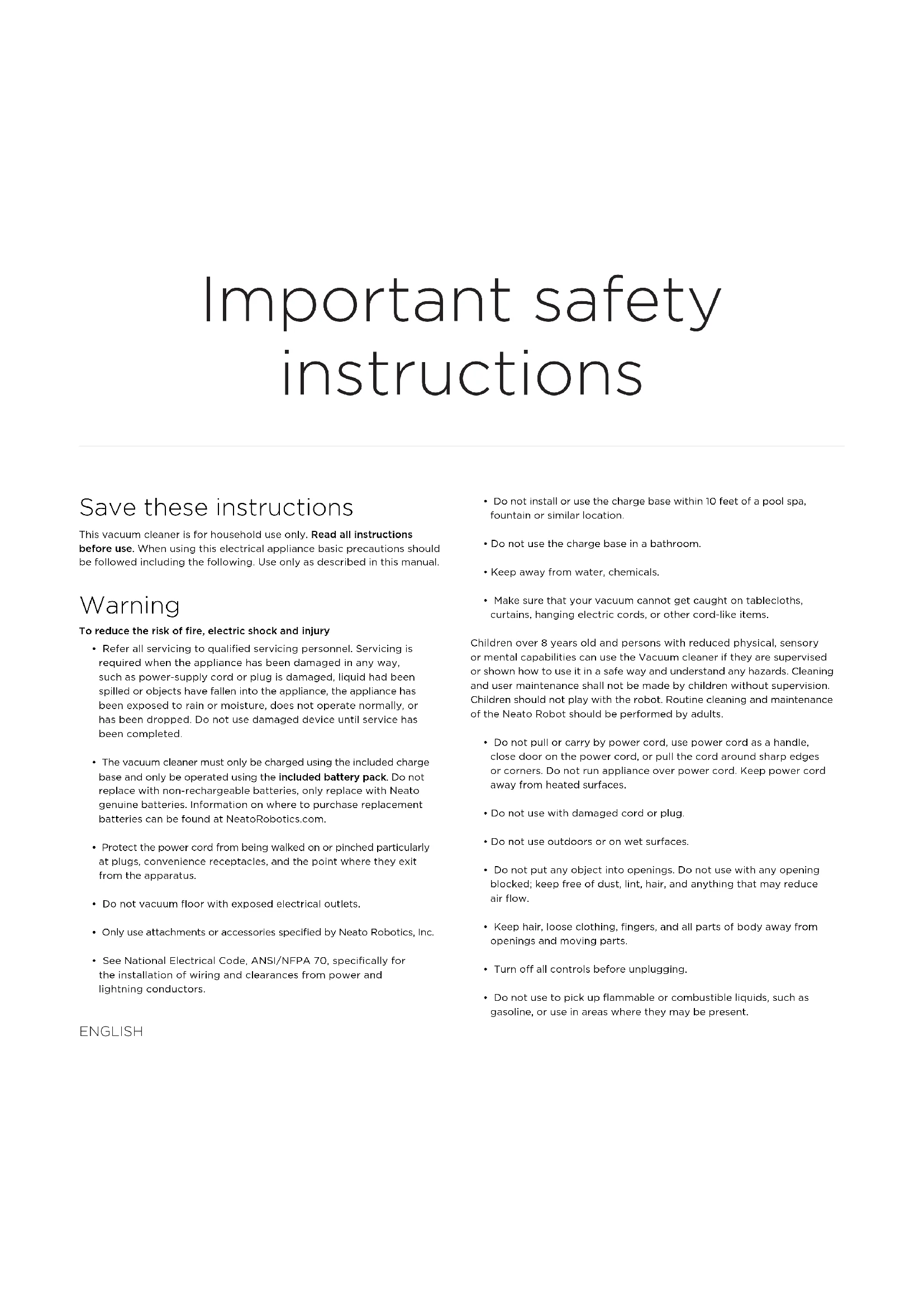 - Only use attachments or accessories specified by Neato Robotics, Inc.