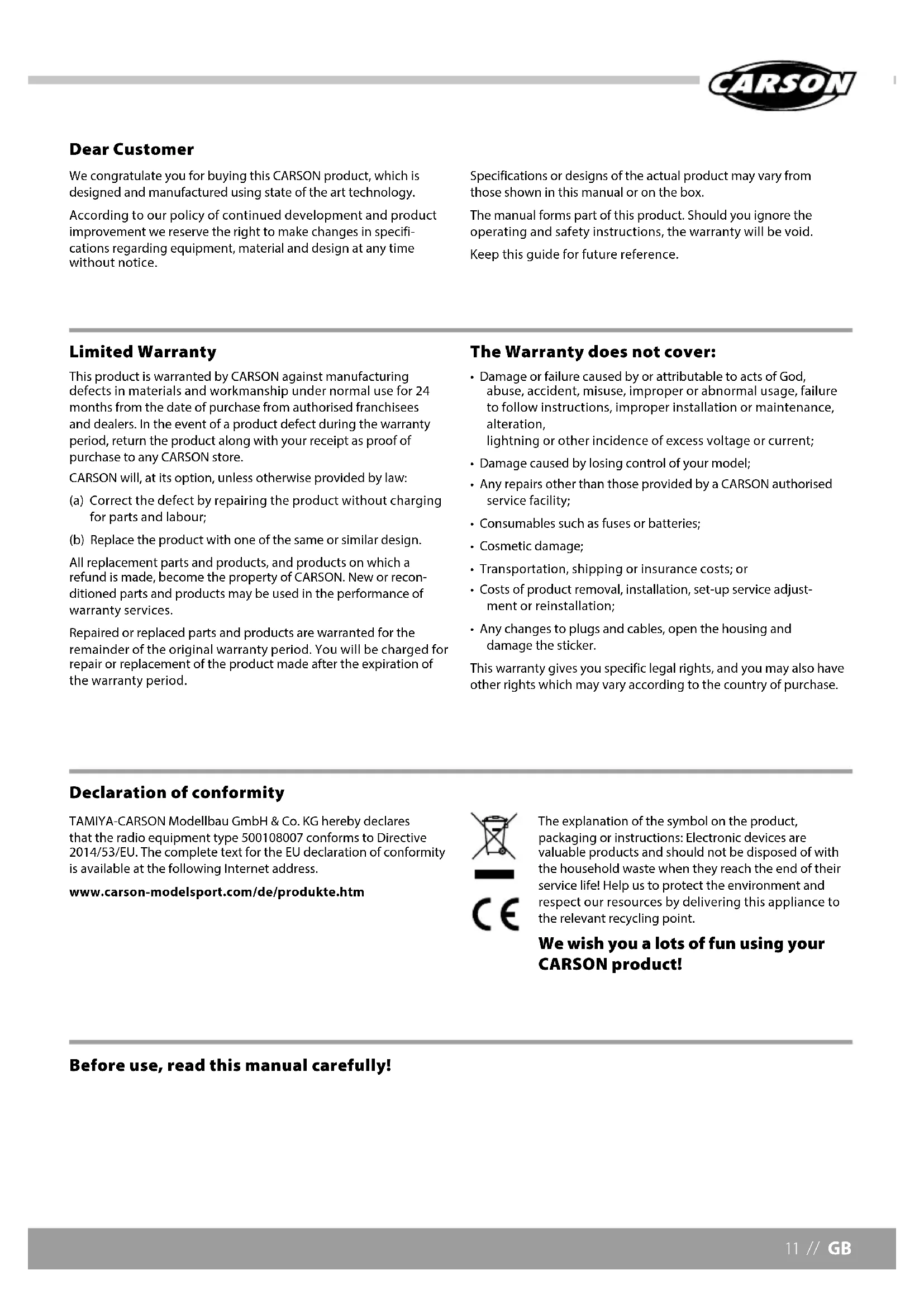 - Any changes to plugs and cables, open the housing and damage the sticker. This warranty gives you specific legal rights, and you may also have other rights which may vary according to the country of purchase. Before use, read this manual carefully! TAMIYA-CARSON Modellbau GmbH & Co. KG hereby declares that the radio equipment type 500108007 conforms to Directive 2014/53/EU. The complete text for the EU declaration of conformity is available at the following Internet address. www.carson-modelsport.com/de/produkte.htm The explanation of the symbol on the product, packaging or instructions: Electronic devices are valuable products and should not be disposed of with the household waste when they reach the end of their service life! Help us to protect the environment and respect our resources by delivering this appliance to the relevant recycling point. We wish you a lots of fun using your CARSON product! Declaration of conformityGB // 12