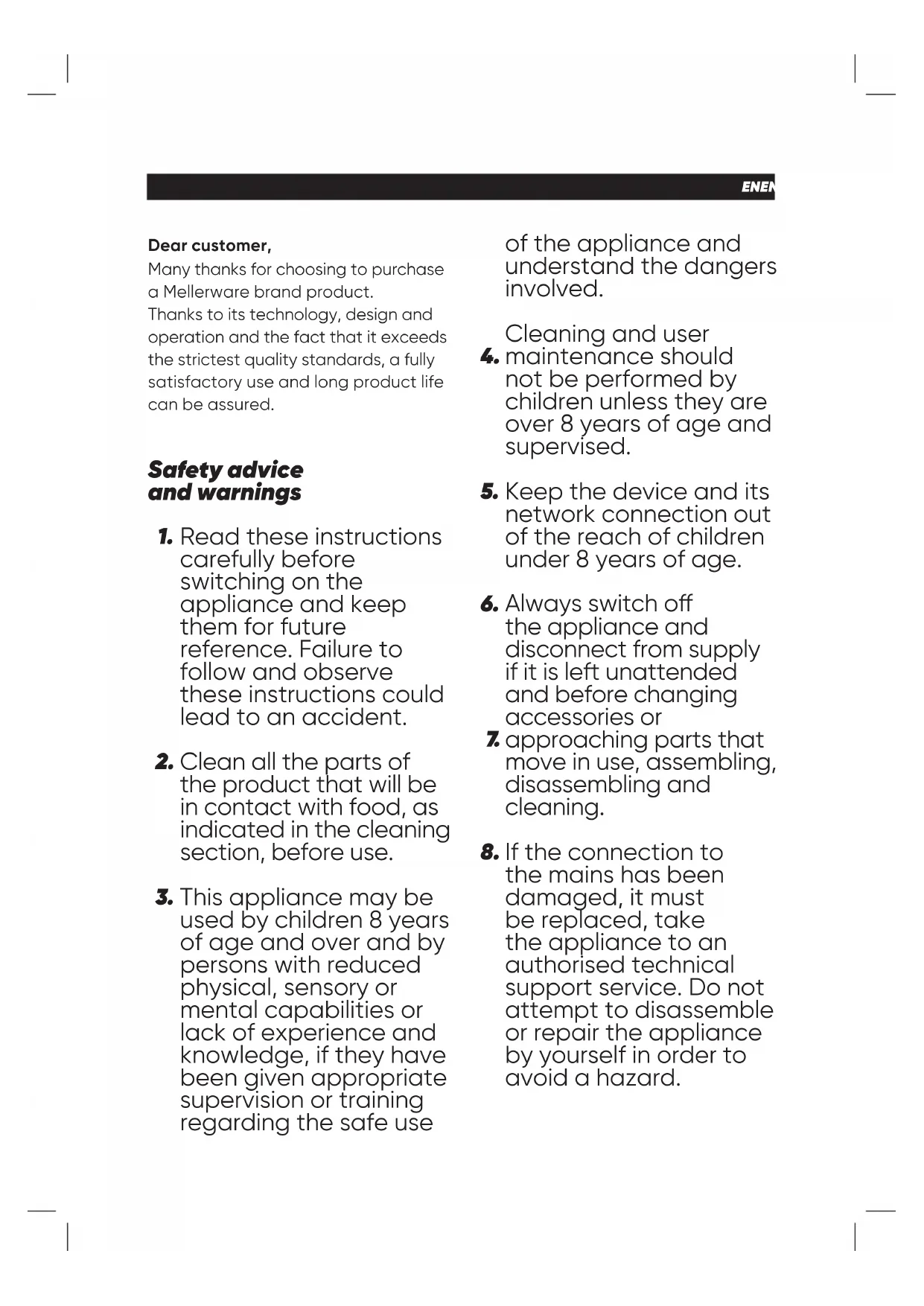 Juicy! Juicer Exprimidor Presse-agrumes Espremedor de citrinos Zitruspresse SpremiagrumiES ENENGLISH Dear customer, Many thanks for choosing to purchase a Mellerware brand product. Thanks to its technology, design and operation and the fact that it exceeds the strictest quality standards, a fully satisfactory use and long product life can be assured. Read these instructions carefully before switching on the appliance and keep them for future reference. Failure to follow and observe these instructions could lead to an accident. Clean all the parts of the product that will be in contact with food, as indicated in the cleaning section, before use. This appliance may be used by children 8 years of age and over and by persons with reduced physical, sensory or mental capabilities or lack of experience and knowledge, if they have been given appropriate supervision or training regarding the safe use Safety advice and warnings of the appliance and understand the dangers involved. Cleaning and user maintenance should not be performed by children unless they are over 8 years of age and supervised. Keep the device and its network connection out of the reach of children under 8 years of age. Always switch o the appliance and disconnect from supply if it is left unattended and before changing accessories or approaching parts that move in use, assembling, disassembling and cleaning. If the connection to the mains has been damaged, it must be replaced, take the appliance to an authorised technical support service. Do not attempt to disassemble or repair the appliance by yourself in order to avoid a hazard.