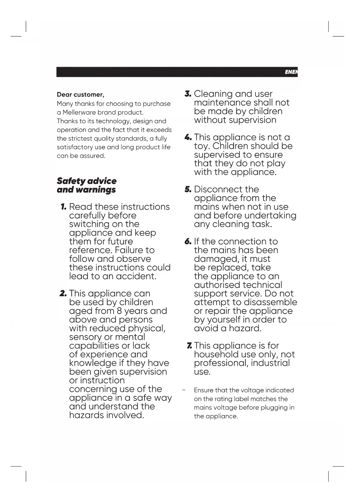 Fig. 1 Fig. 2 Fig. 3 Fig. 4ENENGLISH Dear customer, Many thanks for choosing to purchase a Mellerware brand product. Thanks to its technology, design and operation and the fact that it exceeds the strictest quality standards, a fully satisfactory use and long product life can be assured. Read these instructions carefully before switching on the appliance and keep them for future reference. Failure to follow and observe these instructions could lead to an accident. This appliance can be used by children aged from 8 years and above and persons with reduced physical, sensory or mental capabilities or lack of experience and knowledge if they have been given supervision or instruction concerning use of the appliance in a safe way and understand the hazards involved. Safety advice and warnings Cleaning and user maintenance shall not be made by children without supervision This appliance is not a toy. Children should be supervised to ensure that they do not play with the appliance. Disconnect the appliance from the mains when not in use and before undertaking any cleaning task. If the connection to the mains has been damaged, it must be replaced, take the appliance to an authorised technical support service. Do not attempt to disassemble or repair the appliance by yourself in order to avoid a hazard. This appliance is for household use only, not professional, industrial use. Ensure that the voltage indicated on the rating label matches the mains voltage before plugging in the appliance.