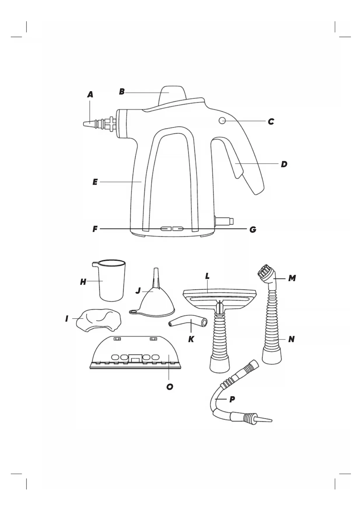 Description A – Accessory base B – Safety cap C – Steam control lock D – Steam control E – Main body F – Red light (heating) G – Green light (ready) ACCESSORIES H – Measuring cup I – Cloth J – Funnel K – Inclined nozzle L – Accesory for fabrics M – Round brush N – Conical nozzle O – Window cleaning accessory P – Flexible hose If the model of your appliance does not have the accessories described above, they can also be bought separately from the Technical Assistance Service. Instructions for use BEFORE USE Make sure that all products’ packaging has been removed.