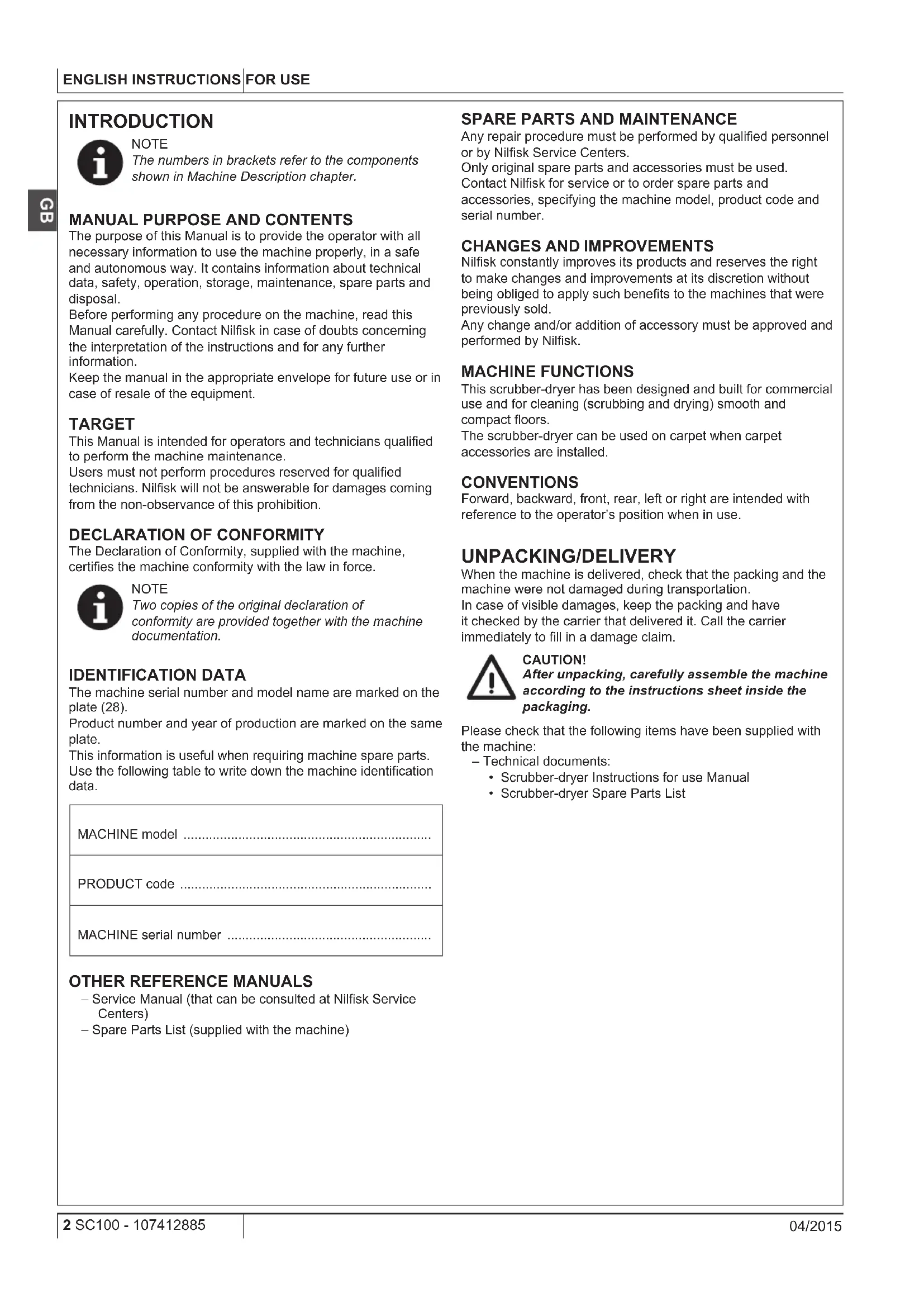 Nilsk constantly improves its products and reserves the right to make changes and improvements at its discretion without being obliged to apply such benets to the machines that were previously sold. Any change and/or addition of accessory must be approved and performed by Nilsk. MACHINE FUNCTIONS This scrubber-dryer has been designed and built for commercial use and for cleaning (scrubbing and drying) smooth and compact oors. The scrubber-dryer can be used on carpet when carpet accessories are installed. CONVENTIONS Forward, backward, front, rear, left or right are intended with reference to the operator’s position when in use. UNPACKING/DELIVERY When the machine is delivered, check that the packing and the machine were not damaged during transportation. In case of visible damages, keep the packing and have it checked by the carrier that delivered it. Call the carrier immediately to ll in a damage claim. CAUTION! After unpacking, carefully assemble the machine according to the instructions sheet inside the packaging. Please check that the following items have been supplied with the machine: – Technical documents:
