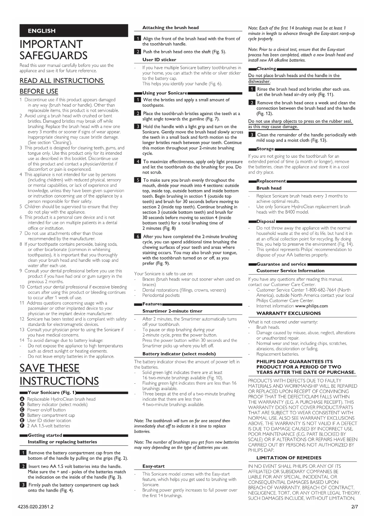 BEFORE USE 1 Discontinue use if this product appears damaged in any way (brush head or handle). Other than replaceable items, this product is not serviceable. 2 Avoid using a brush head with crushed or bent bristles. Damaged bristles may break off while brushing. Replace the brush head with a new one every 3 months or sooner if signs of wear appear. Inappropriate cleaning may cause bristle damage. (See section ‘Cleaning’). 3 This product is designed for cleaning teeth, gums, and tongue only. Use this product only for its intended use as described in this booklet. Discontinue use of this product and contact a physician/dentist if discomfort or pain is experienced. 4 This appliance is not intended for use by persons (including children) with reduced physical, sensory or mental capabilities, or lack of experience and knowledge, unless they have been given supervision or instruction concerning use of the appliance by a person responsible for their safety. 5 Children should be supervised to ensure that they do not play with the appliance. 6 This product is a personal care device and is not intended for use on multiple patients in a dental ofce or institution. 7 Do not use attachments other than those recommended by the manufacturer. 8 If your toothpaste contains peroxide, baking soda, or other bicarbonate (common in whitening toothpastes), it is important that you thoroughly clean your brush head and handle with soap and water after each use. 9 Consult your dental professional before you use this product if you have had oral or gum surgery in the previous 2 months. 10 Contact your dental professional if excessive bleeding occurs after using this product or bleeding continues to occur after 1 week of use. 11 Address questions concerning usage with a pacemaker or other implanted device to your physician or the implant device manufacturer. 12 Sonicare has been tested and is compliant with safety standards for electromagnetic devices. 13 Consult your physician prior to using the Sonicare if you have medical concerns. 14 To avoid damage due to battery leakage: Do not expose the appliance to high temperatures such as direct sunlight or heating elements. Do not leave empty batteries in the appliance. SAVE THESE INSTRUCTIONS Your Sonicare (Fig. 1) A Replaceable HydroClean brush head B Battery indicator (select models) C Power on/off button D Battery compartment cap E User ID sticker location F 2 AA 1.5-volt batteries Getting started Installing or replacing batteries 1 Remove the battery compartment cap from the bottom of the handle by pulling on the grips (Fig. 2). 2 Insert two AA 1.5 volt batteries into the handle. Make sure the + and - poles of the batteries match the indication on the inside of the handle (Fig. 3). 3 Firmly push the battery compartment cap back onto the handle (Fig. 4).