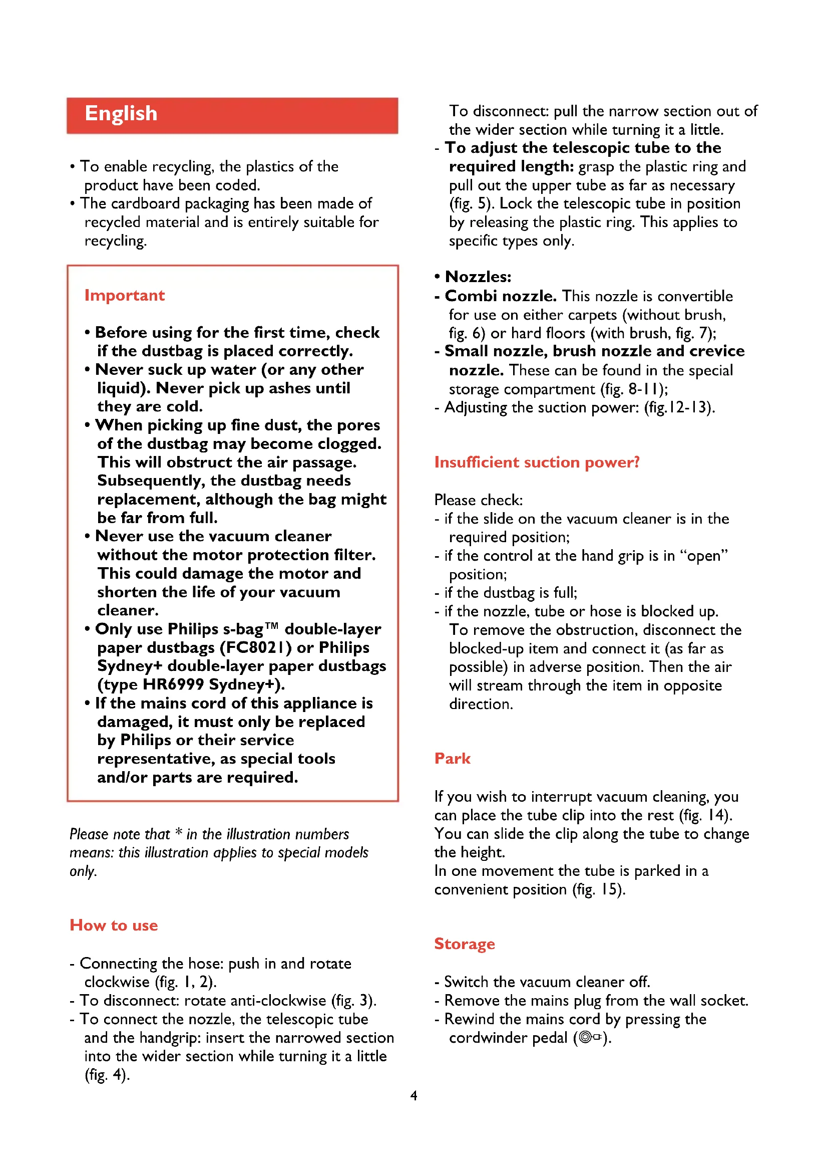 - If the mains cord of this appliance is damaged, it must only be replaced by Philips or their service representative, as special tools and/or parts are required. English Please note that * in the illustration numbers means: this illustration applies to special models only. How to use - Connecting the hose: push in and rotate clockwise (fig. 1, 2). - To disconnect: rotate anti-clockwise (fig. 3). - To connect the nozzle, the telescopic tube and the handgrip: insert the narrowed section into the wider section while turning it a little (fig. 4).5 - Hitch the lower tube onto the vacuum cleaner (fig. 16-17). You can slide the clip along the tube to change the height. Replacing the dustbag Replace the dustbag as soon as the “dustbag full indicator” becomes red, even when the nozzle is not placed on a surface (fig. 18). - Switch the vacuum cleaner off. - Open the cover (fig. 19). - Push the dustbag holder backwards (fig. 20). - Remove the full dustbag by pulling the cardboard tag (fig. 21). This automatically closes the dustbag. - Slide the cardboard front plate of the new dustbag into the two slots of the dustbag holder as far as possible (fig. 22). - Push the dustbag holder forwards (“Click!”) (fig. 23). Note that it is not possible to close the cover when no dustbag has been placed.