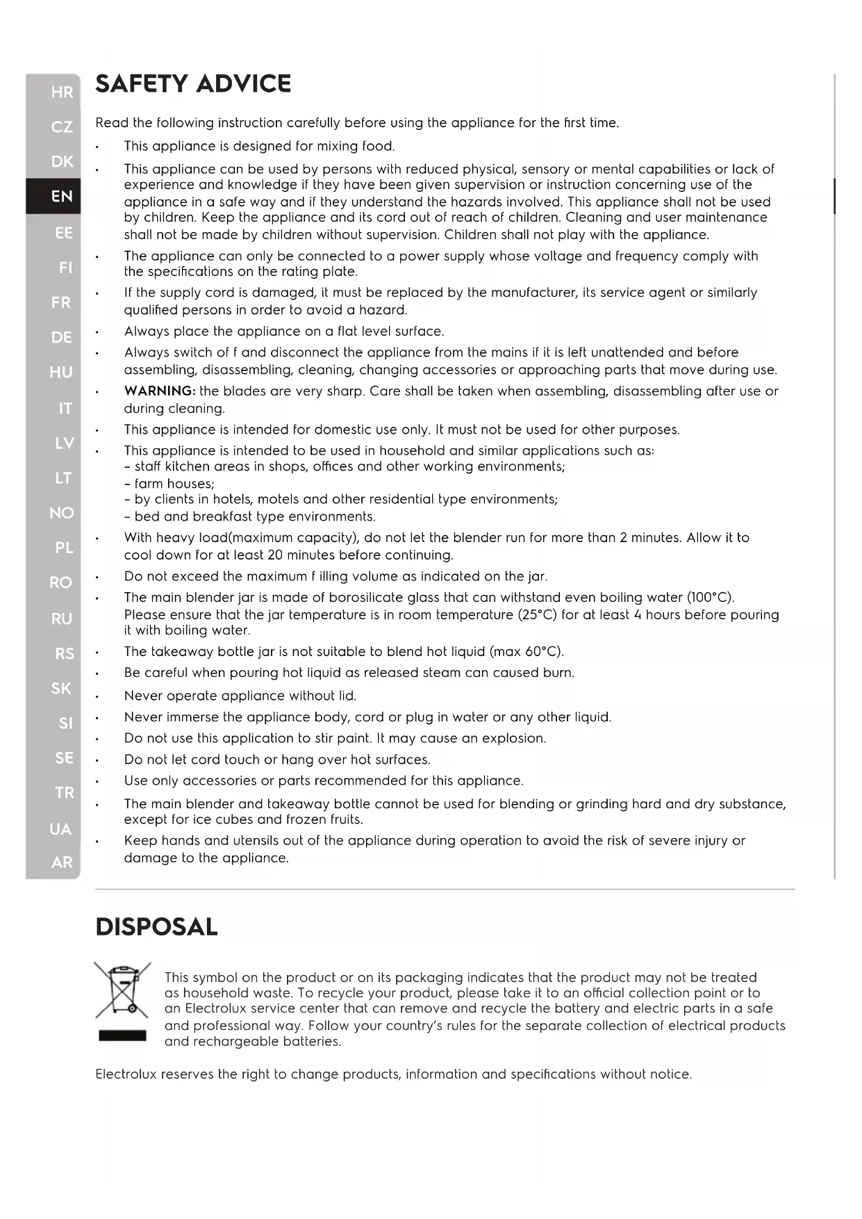 ARSAFETY ADVICE DISPOSAL This symbol on the product or on its packaging indicates that the product may not be treated as household waste. To recycle your product, please take it to an official collection point or to an Electrolux service center that can remove and recycle the battery and electric parts in a safe and professional way. Follow your country’s rules for the separate collection of electrical products and rechargeable batteries. Electrolux reserves the right to change products, information and specifications without notice. Read the following instruction carefully before using the appliance for the first time.