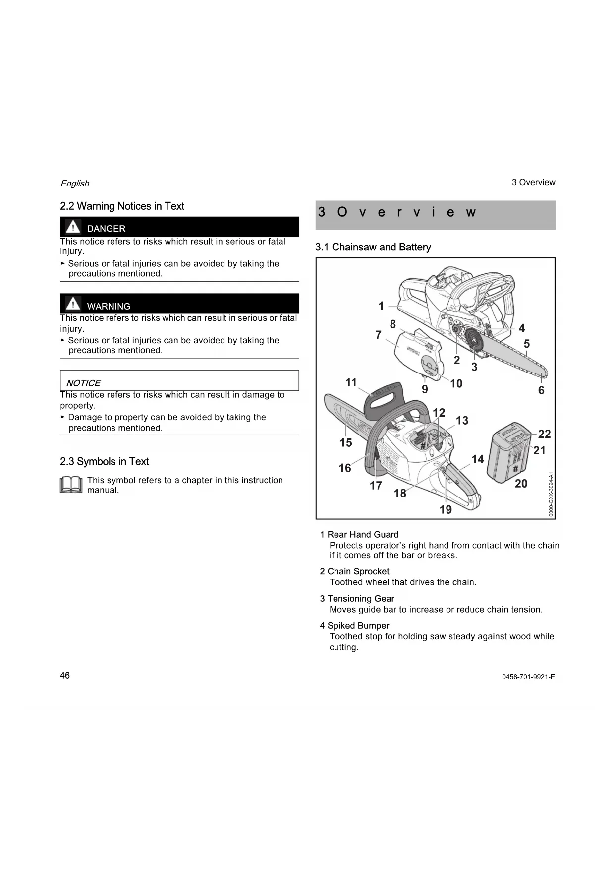 1 Rear Hand Guard Protects operator’s right hand from contact with the chain if it comes off the bar or breaks. 2 Chain Sprocket Toothed wheel that drives the chain. 3 Tensioning Gear Moves guide bar to increase or reduce chain tension. 4 Spiked Bumper Toothed stop for holding saw steady against wood while cutting. This symbol refers to a chapter in this instruction manual. 3Overview