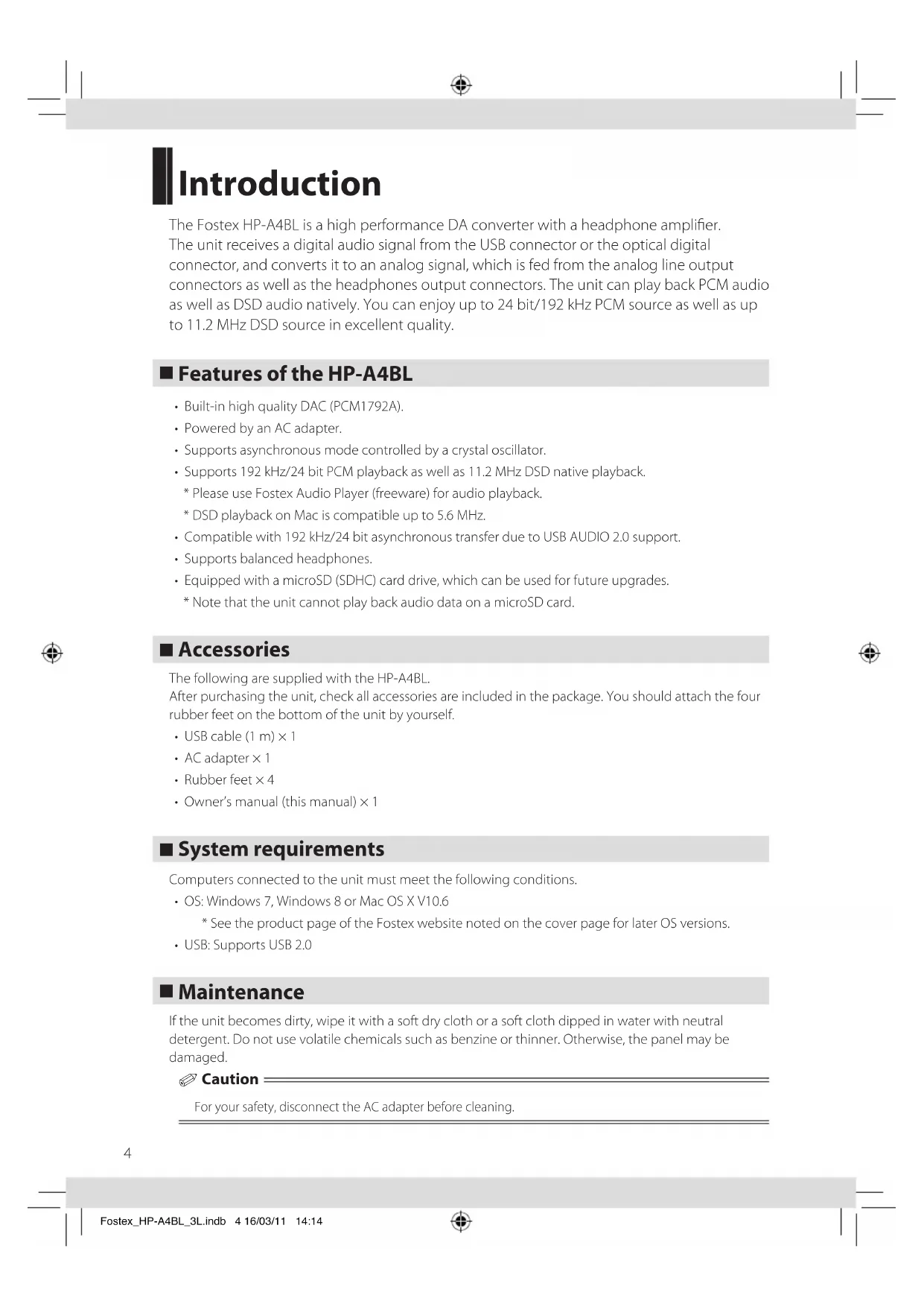 - The volume control knob does not aect the output level of the [DIGITAL OUT] terminal. Fostex_HP-A4BL_3L.indb 10 16/03/11 14:1411 Specications Input [USB] terminal Interface USB 2.0 high speed Supported sampling frequency PCM: 44.1 kHz, 48 kHz, 88.2 kHz, 96 kHz, 176.4 kHz, 192 kHz DSD: 2.8 MHz, 5.6 MHz, 11.2 MHz (* Up to 5.6 MHz on Mac) Supported quantization bit width 16 bit, 24 bit [DIGITAL IN] terminal Connector type TOSLINK optical Format S/PDIF Supported sampling frequency