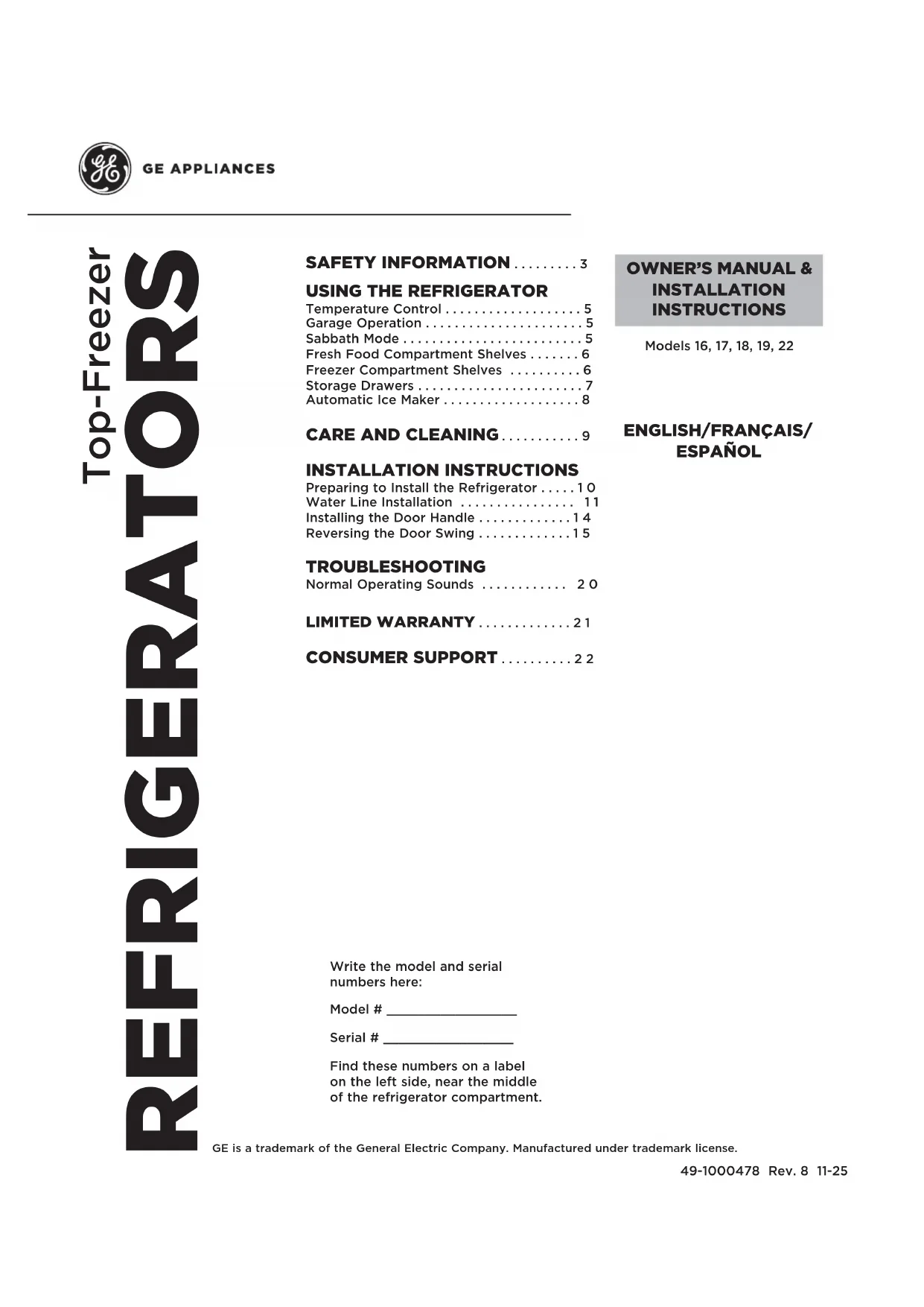 INSTALLATION INSTRUCTIONS REFRIGERATORS Top-Freezer GE is a trademark of the General Electric Company. Manufactured under trademark license.2 49-1000478 Rev. 8 THANK YOU FOR MAKING GE APPLIANCES A PART OF YOUR HOME. Whether you grew up with GE Appliances, or this is your first, we’re happy to have you in the family. We take pride in the craftsmanship, innovation and design that goes into every GE Appliances product, and we think you will too. Among other things, registration of your appliance ensures that we can deliver important product information and warranty details when you need them. Register your GE appliance now online. Helpful websites and phone numbers are available in the Consumer Support section of this Owner’s Manual. You may also mail in the pre-printed registration card included in the packing material.49-1000478 Rev. 8 3 CAUTION To reduce the risk of injury when using your refrigerator, follow these basic safety precautions. Ŷ 'RQRWFOHDQJODVVVKHOYHVRUFRYHUVZLWKZDUP water when they are cold. Glass shelves and covers may break if exposed to sudden temperature changes or impact, such as bumping or dropping. Tempered glass is designed to shatter into many small pieces if it breaks.