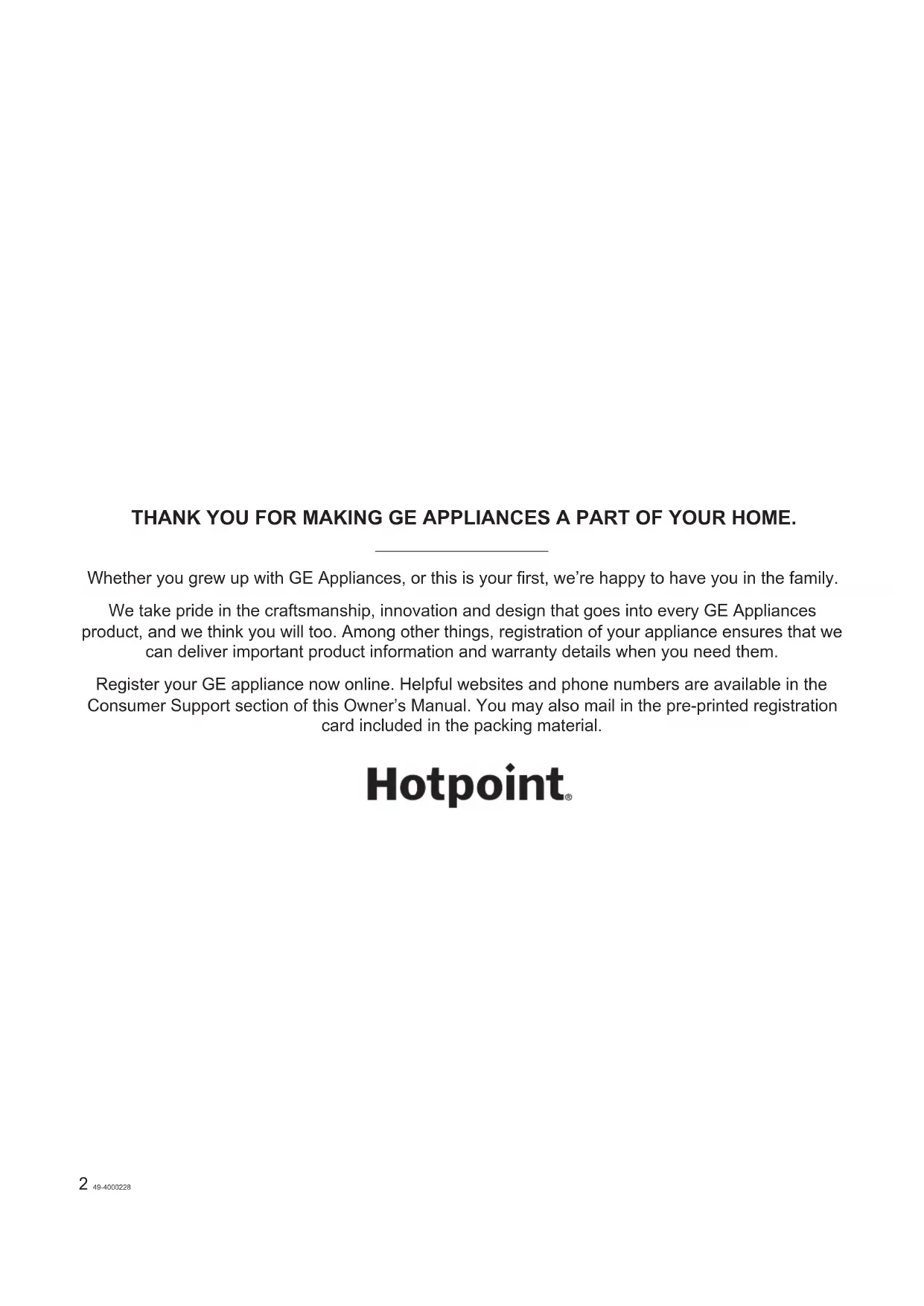 THANK YOU FOR MAKING GE APPLIANCES A PART OF YOUR HOME. Whether you grew up with GE Appliances, or this is your first, we’re happy to have you in the family. We take pride in the craftsmanship, innovation and design that goes into every GE Appliances product, and we think you will too. Among other things, registration of your appliance ensures that we can deliver important product information and warranty details when you need them. Register your GE appliance now online. Helpful websites and phone numbers are available in the Consumer Support section of this Owner’s Manual. You may also mail in the pre-printed registration card included in the packing material.49-4000228 3