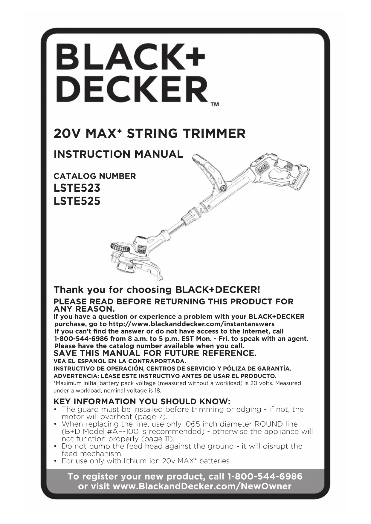Thank you for choosing BLACK+DECKER! PLEASE READ BEFORE RETURNING THIS PRODUCT FOR ANY REASON. If you have a question or experience a problem with your BLACK+DECKER purchase, go to http://www.blackanddecker.com/instantanswers If you can’t find the answer or do not have access to the Internet, call 1-800-544-6986 from 8 a.m. to 5 p.m. EST Mon. - Fri. to speak with an agent. Please have the catalog number available when you call.SAVE THIS MANUAL FOR FUTURE REFERENCE.VEA EL ESPANOL EN LA CONTRAPORTADA.INSTRUCTIVO DE OPERACIÓN, CENTROS DE SERVICIO Y PÓLIZA DE GARANTÍA. ADVERTENCIA: LÉASE ESTE INSTRUCTIVO ANTES DE USAR EL PRODUCTO.*Maximum initial battery pack voltage (measured without a workload) is 20 volts. Measured under a workload, nominal voltage is 18.CATALOG NUMBER LSTE523 LSTE525 KEY INFORMATION YOU SHOULD KNOW:• The guard must be installed before trimming or edging - if not, the motor will overheat (page 7).• When replacing the line, use only .065 inch diameter ROUND line (B+D Model #AF-100 is recommended) - otherwise the appliance will not function properly (page 11).• Do not bump the feed head against the ground - it will disrupt the feed mechanism. For use only with lithium-ion 20v MAX* batteries.2 Important Safety Warnings