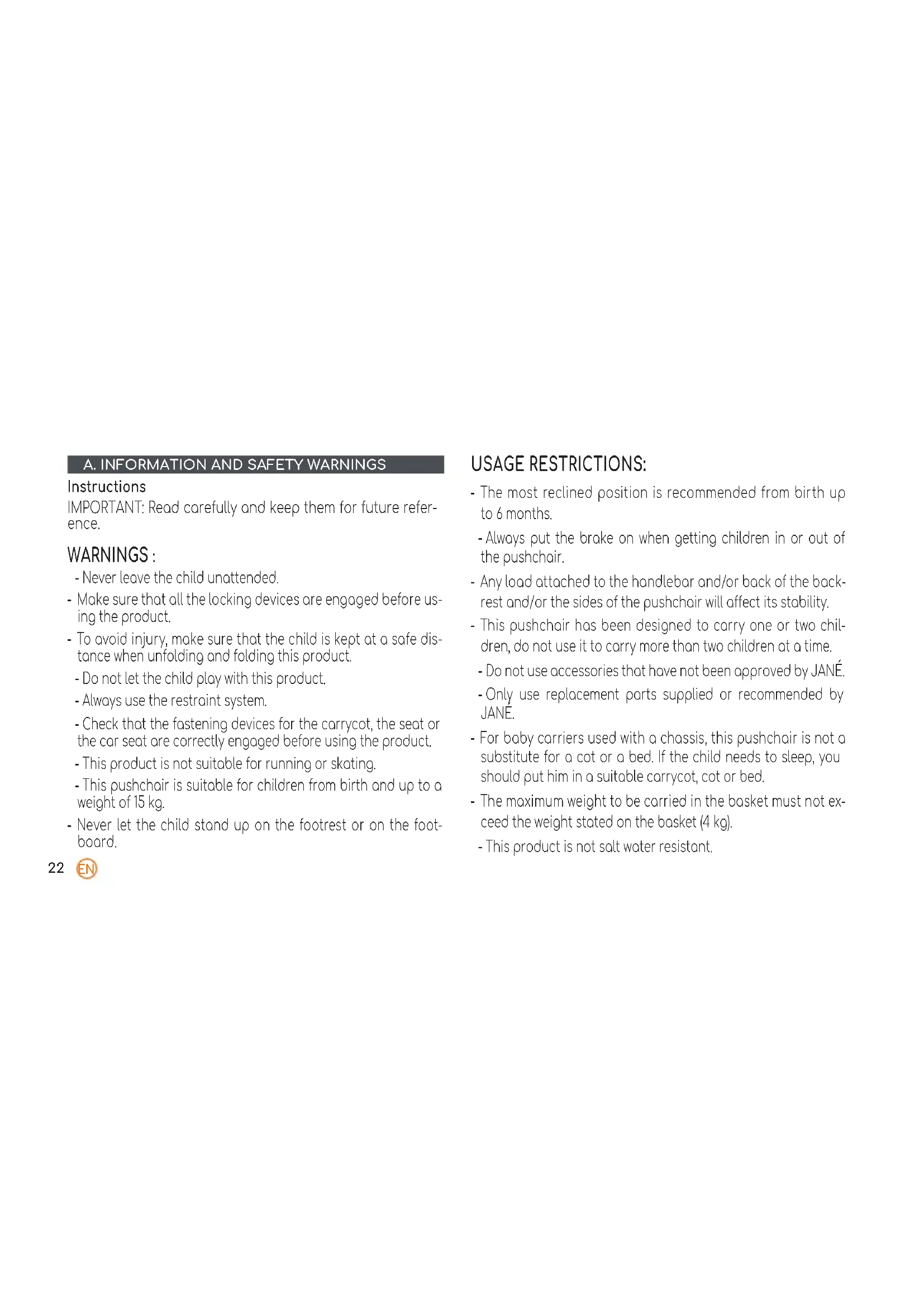 Instructions IMPORTANT: Read carefully and keep them for future refer- ence. WARNINGS : - Never leave the child unattended. - Make sure that all the locking devices are engaged before us- ing the product. - To avoid injury, make sure that the child is kept at a safe dis- tance when unfolding and folding this product. - Do not let the child play with this product. - Always use the restraint system. - Check that the fastening devices for the carrycot, the seat or the car seat are correctly engaged before using the product. - This product is not suitable for running or skating. - This pushchair is suitable for children from birth and up to a weight of 15 kg. - Never let the child stand up on the footrest or on the foot- board. USAGE RESTRICTIONS: - The most reclined position is recommended from birth up to 6 months. - Always put the brake on when getting children in or out of the pushchair. - Any load attached to the handlebar and/or back of the back- rest and/or the sides of the pushchair will aect its stability. - This pushchair has been designed to carry one or two chil- dren, do not use it to carry more than two children at a time. - Do not use accessories that have not been approved by JANÉ. - Only use replacement parts supplied or recommended by JANÉ. - For baby carriers used with a chassis, this pushchair is not a substitute for a cot or a bed. If the child needs to sleep, you should put him in a suitable carrycot, cot or bed. - The maximum weight to be carried in the basket must not ex- ceed the weight stated on the basket (4 kg). - This product is not salt water resistant.23