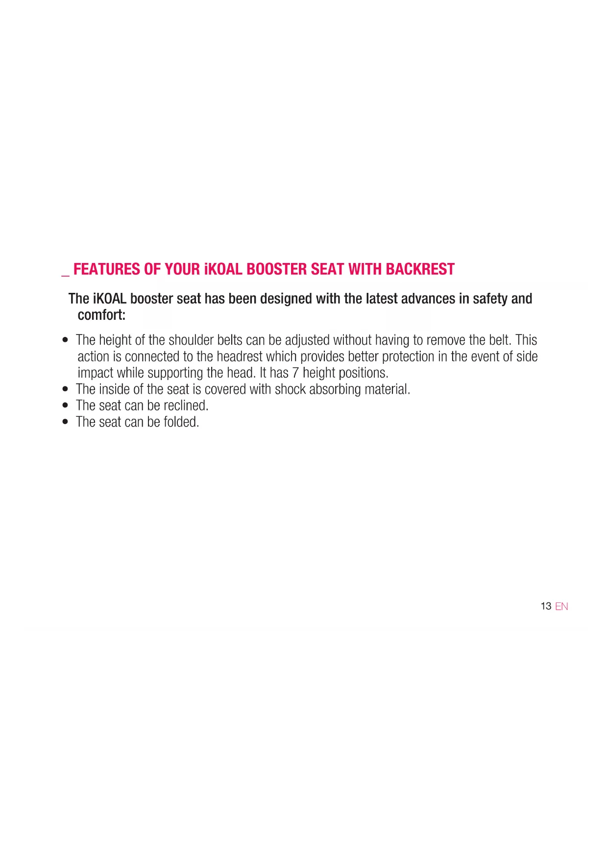 _ FEATURES OF YOUR iKOAL BOOSTER SEAT WITH BACKREST The iKOAL booster seat has been designed with the latest advances in safety and comfort: