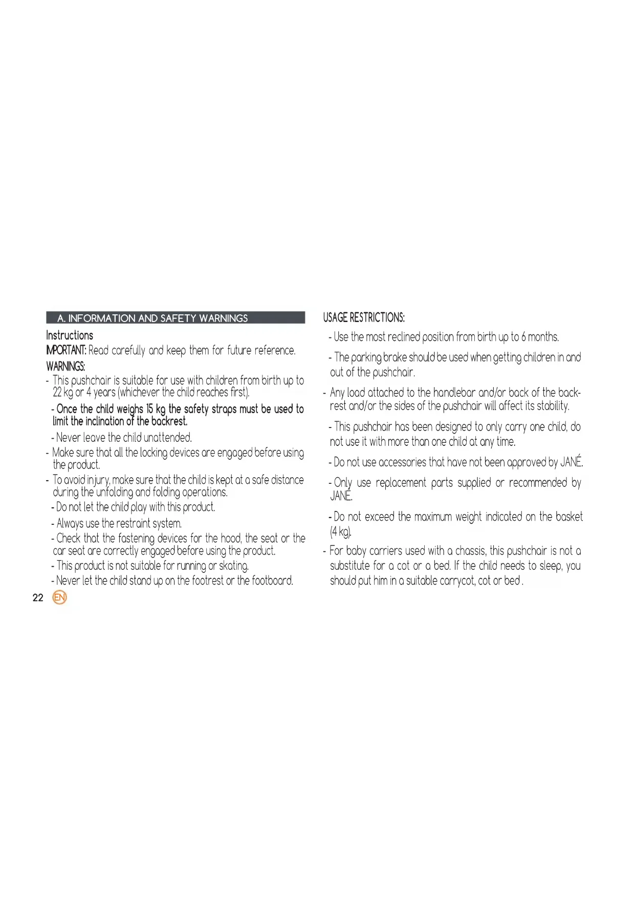 Instructions IMPORTANT: Read carefully and keep them for future reference. WARNINGS: - This pushchair is suitable for use with children from birth up to 22 kg or 4 years (whichever the child reaches rst). - Once the child weighs 15 kg the safety straps must be used to limit the inclination of the backrest. - Never leave the child unattended. - Make sure that all the locking devices are engaged before using the product. - To avoid injury, make sure that the child is kept at a safe distance during the unfolding and folding operations. - Do not let the child play with this product. - Always use the restraint system. - Check that the fastening devices for the hood, the seat or the car seat are correctly engaged before using the product. - This product is not suitable for running or skating. - Never let the child stand up on the footrest or the footboard. USAGE RESTRICTIONS: - Use the most reclined position from birth up to 6 months. - The parking brake should be used when getting children in and out of the pushchair. - Any load attached to the handlebar and/or back of the back- rest and/or the sides of the pushchair will affect its stability. - This pushchair has been designed to only carry one child, do not use it with more than one child at any time. - Do not use accessories that have not been approved by JANÉ. - Only use replacement parts supplied or recommended by JANÉ. - Do not exceed the maximum weight indicated on the basket (4 kg). - For baby carriers used with a chassis, this pushchair is not a substitute for a cot or a bed. If the child needs to sleep, you should put him in a suitable carrycot, cot or bed