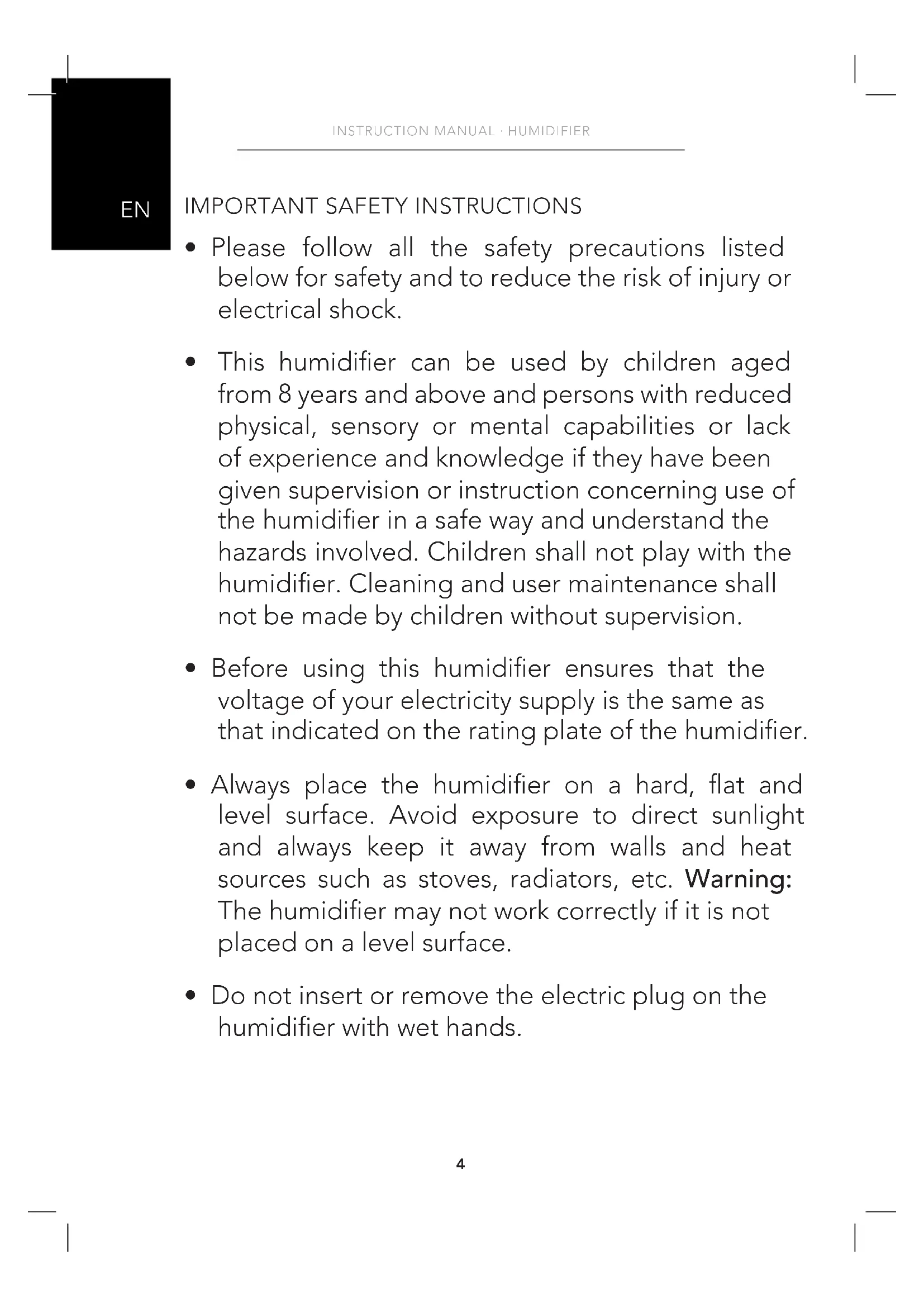 - Do not insert or remove the electric plug on the humidier with wet hands.5