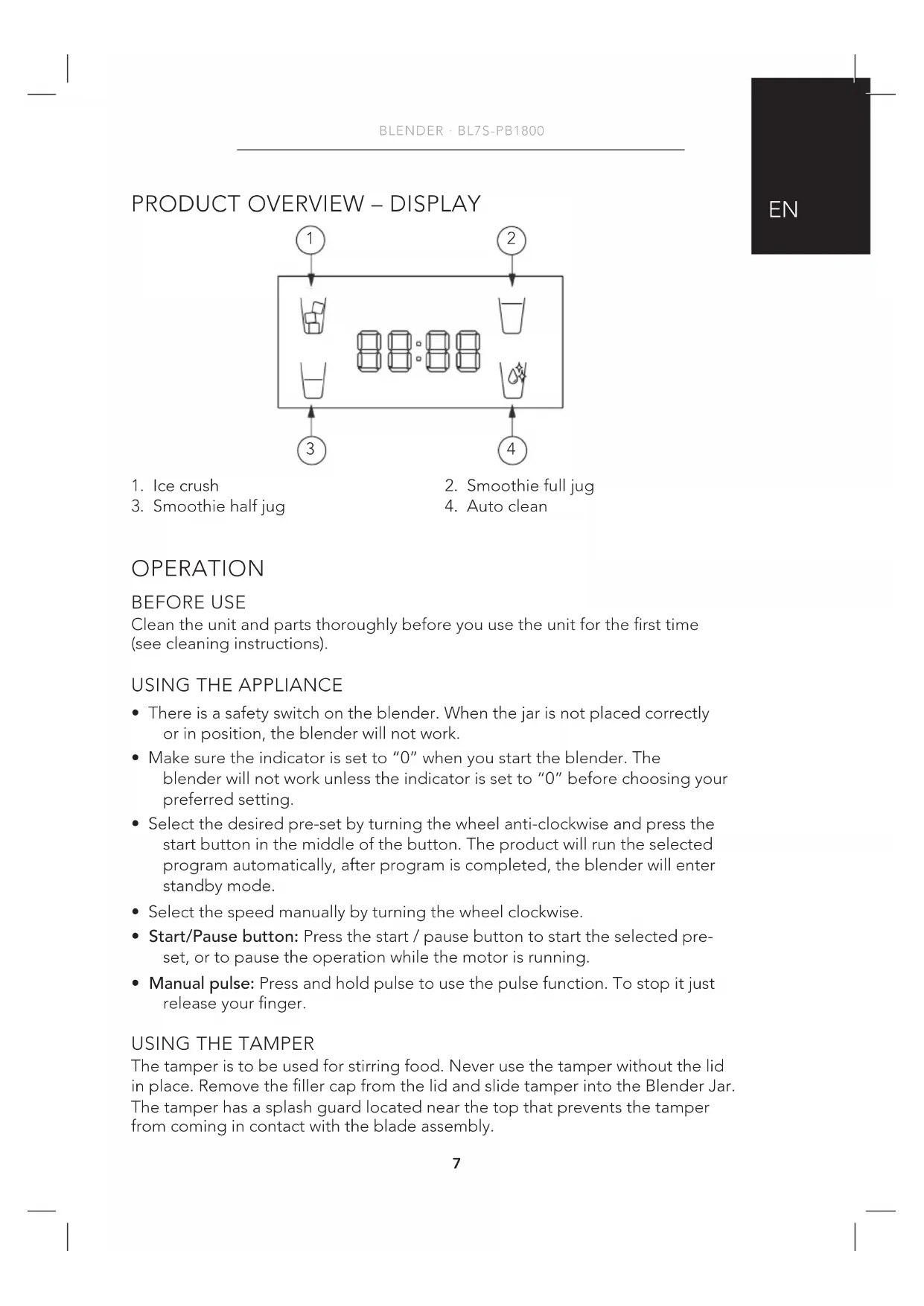PRESET PROGRAMS Function Program Operation cycle Ice crush Put ice cubes into the jug, not more than 180g ice, and press start. If the ice sticks, add some water. Smoothie Full jug Use this program when you want a full jug with smoothie. Do not ll over the max line on the jug. 120 seconds Smoothie Half jug When you are making a smaller batch with smoothie. For half a jug, ll up to 0.9L. 92 Seconds Auto clean Put 1.8L water into the jug and run this program to clean the jug. 45 seconds TROUBLESHOOTING Problem Possible reason Solution The blender will not start. The switch is not set to 0 Is the jug properly placed? Turn the switch to 0. The icons should stop blinking, and you can choose a pre set program or manual speed Place the jug correctly onto the base Blender stops The blender has run more than 2 minutes. Let the motor cool down Content does not blend properly Not enough uid Use the temper, or consider adding more uid in the jar to help circulation9