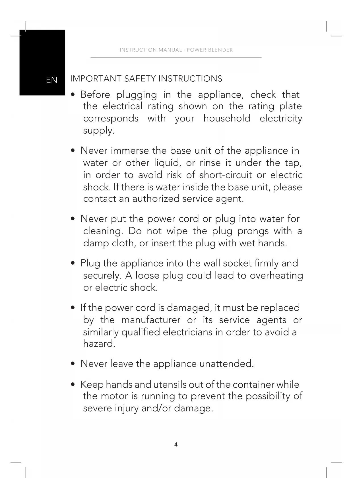 - Never immerse the base unit of the appliance in water or other liquid, or rinse it under the tap, in order to avoid risk of short-circuit or electric shock. If there is water inside the base unit, please contact an authorized service agent.