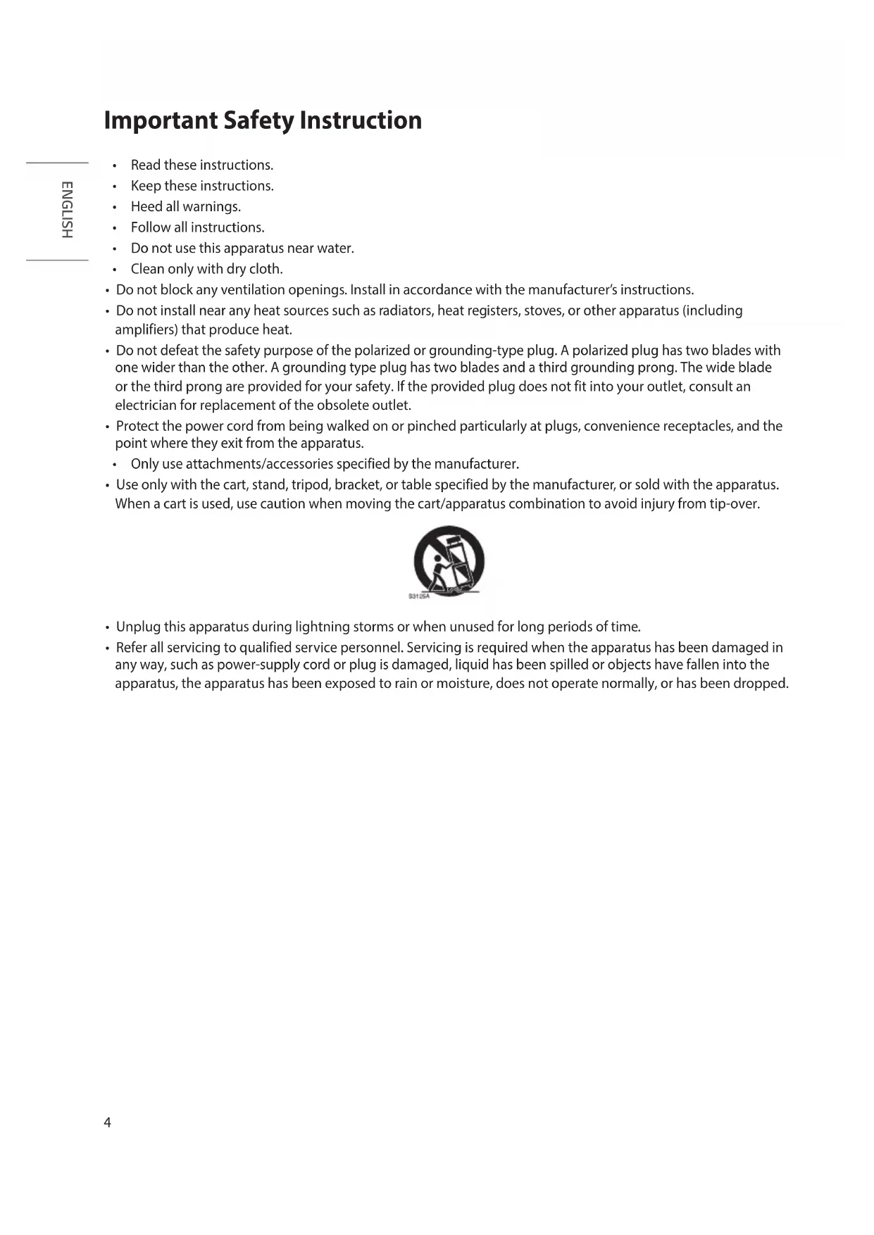 - Use only with the cart, stand, tripod, bracket, or table specified by the manufacturer, or sold with the apparatus. When a cart is used, use caution when moving the cart/apparatus combination to avoid injury from tip-over.