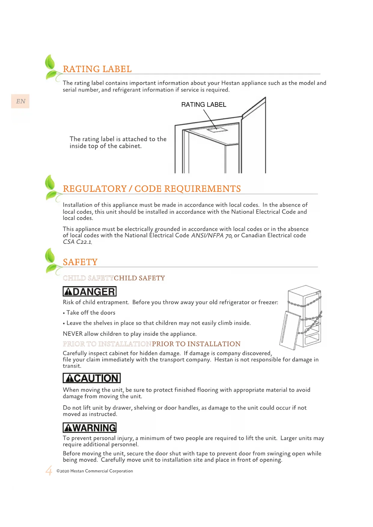 RATING LABEL The rating label contains important information about your Hestan appliance such as the model and serial number, and refrigerant information if service is required. The rating label is attached to the inside top of the cabinet. RATING LABEL